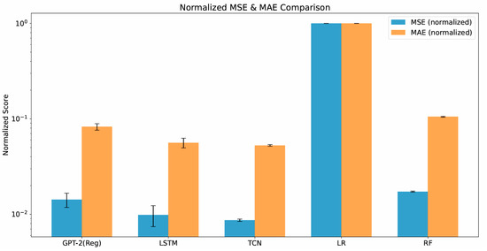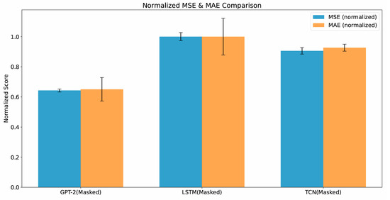 Moreover, we conducted comparative experiments with the LLM-based traffic prediction method against traditional prediction models on the normalized score. As shown in Figure 5, the GPT-2 model outperforms classical methods such as random forest (RF in the figure) [35] and linear regression (LR in the figure) in terms of prediction accuracy and responsiveness to violent fluctuations in traffic, which verifies its generalization ability in complex network environments, although it performs slightly weaker than specialized time-series models such as LSTM and TCN under full-input settings. In addition, to further assess robustness, we compared GPT-2 with specialized time-series models under perturbed input conditions, where 30% of the input sequence was randomly masked to simulate disturbances. As shown in Figure 6, GPT-2 achieves superior performance compared to LSTM and TCN in this setting. This demonstrates that GPT-2 is more resilient to noisy or incomplete observations. Moreover, given their flexibility in processing heterogeneous data types and structures, LLMs present greater potential for practical deployment and broader applicability in future networking scenarios.