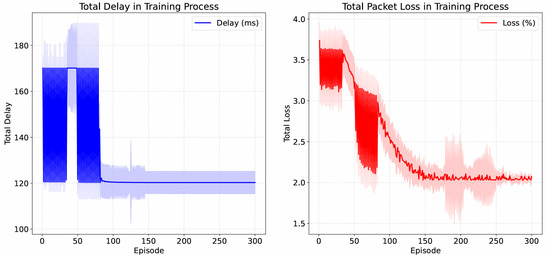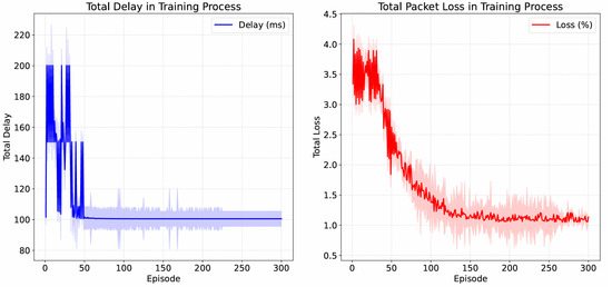 Figure 9 shows that, in the initial stage of training, the intelligent agent conducts thorough exploration and tries various traffic distribution strategies. As a result, the delay and packet loss rate are relatively high and fluctuate greatly. As the intelligent agent gradually learns the reasonable traffic distribution strategy, the curve gradually decreases and approaches stability. Thus, it can be seen that the intelligent agent can conduct exploration and learning in a relatively short period of time and allocate network bandwidth reasonably, thereby gradually reducing and converging the network delay and packet loss rate and achieving better network optimization performance.