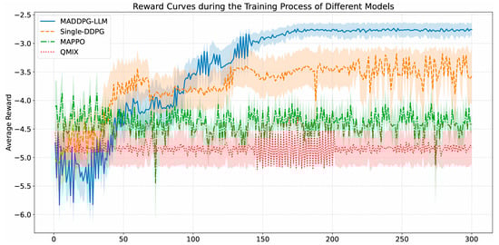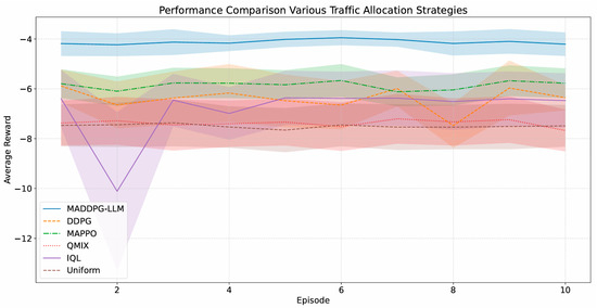 Moreover, we compare the MADDPG with priority allocation strategy (Uniform), the Deep Deterministic Policy Gradient (DDPG) algorithm [36], the Independent Q-Learning (IQL) algorithm [37], the Q-value Mixing (QMIX) algorithm [38], and the Multi-Agent Proximal Policy Optimization (MAPPO) algorithm [39]. Figure 11 presents the reward curves obtained during the training process of each algorithm. The analysis indicates that the MADDPG algorithm converges at approximately 100 epochs, whereas the DDPG algorithm requires nearly 250 epochs to reach convergence. Further investigation of the MAPPO and QMIX algorithms reveals that they necessitate a minimum of 500 epochs to achieve basic convergence. In addition, ablation experiments comparing standard MADDPG with the LLM-enhanced version show that incorporating traffic prediction yields higher rewards and greater robustness, validating the proposed approach and its shift from reactive adaptation to proactive optimization. Consequently, MADDPG demonstrates superior performance compared to the other algorithms in terms of convergence behavior and training stability.