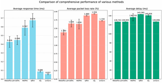 In conclusion, we conducted multiple rounds of testing and analyzed the average values of latency, packet loss rate, and response time, as illustrated in Figure 13. While the proposed algorithm exhibits a longer response time compared to certain other algorithms, the differences remain within an acceptable range, enabling effective real-time network optimization. Furthermore, the algorithm demonstrates significantly better performance in terms of both latency and packet loss rate. Therefore, by leveraging real-time sensor data, the system ensures accurate monitoring and proactive resource scheduling, ultimately reducing latency and improving overall network efficiency.