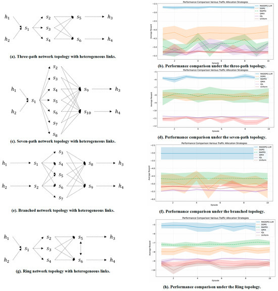 Network topology structures (left) and performance comparison results (right) under five topologies: (a,b) three-path, (c,d) seven-path, (e,f) branched, and (g,h) ring. The five-path topology was already presented as the baseline in Figure 6, Figure 7, Figure 8, Figure 9, Figure 10, Figure 11 and Figure 12.