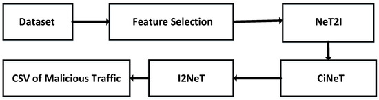 Among publicly available datasets, InSDN contains the most recently collected data for malicious and non-malicious traffic. The dataset contains multi-classes and has been collated on a Software Defined Networking environment with 80 features; 18% of the dataset consists of malicious network data. The ToN_IoT dataset is another comprehensive dataset consisting of multi-class traffic along with malicious and non-malicious traffic. The dataset contains 44 features with approximately 15% of the dataset classified as malicious. Finally, the UNSW-NB 15 dataset contains 49 features, with 12% of the available traffic in the dataset corresponding to malicious traffic. The workflow of the proposed algorithms and their applications on the datasets is shown in Figure 2. Due to class imbalance in the datasets, to ensure fairness in representation, the training, validation, and testing datasets were generated using stratified sampling to ensure class distribution. Furthermore, class-weighted loss functions were also applied during the training stage. Thus, improving model fairness and performance on minority classes. CSV files were extrapolated from the datasets and used as input to the NeT2I algorithm, generating PNG images based on the network traffic. The generated PNG images are then input into the CiNeT algorithm. Following detection by the CiNeT algorithm, the I2NeT algorithm is used to decode the images back to a CSV file in order to evaluate the accuracy of our detection algorithm. The following Table 1 shows the selected features for each dataset, through Recursive Feature Elimination with Random Forest due to its ability to handle data with high dimensions and its ability to handle non-linear complex interactions [72].