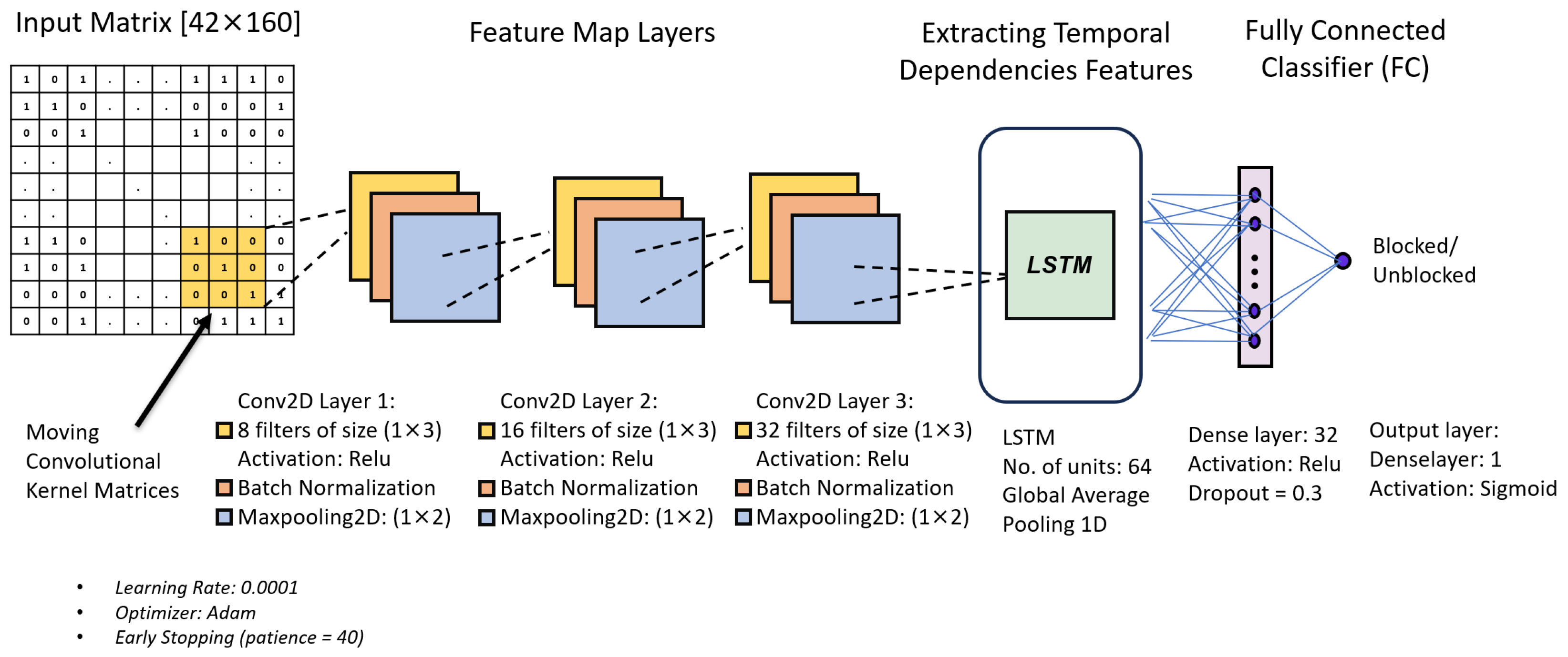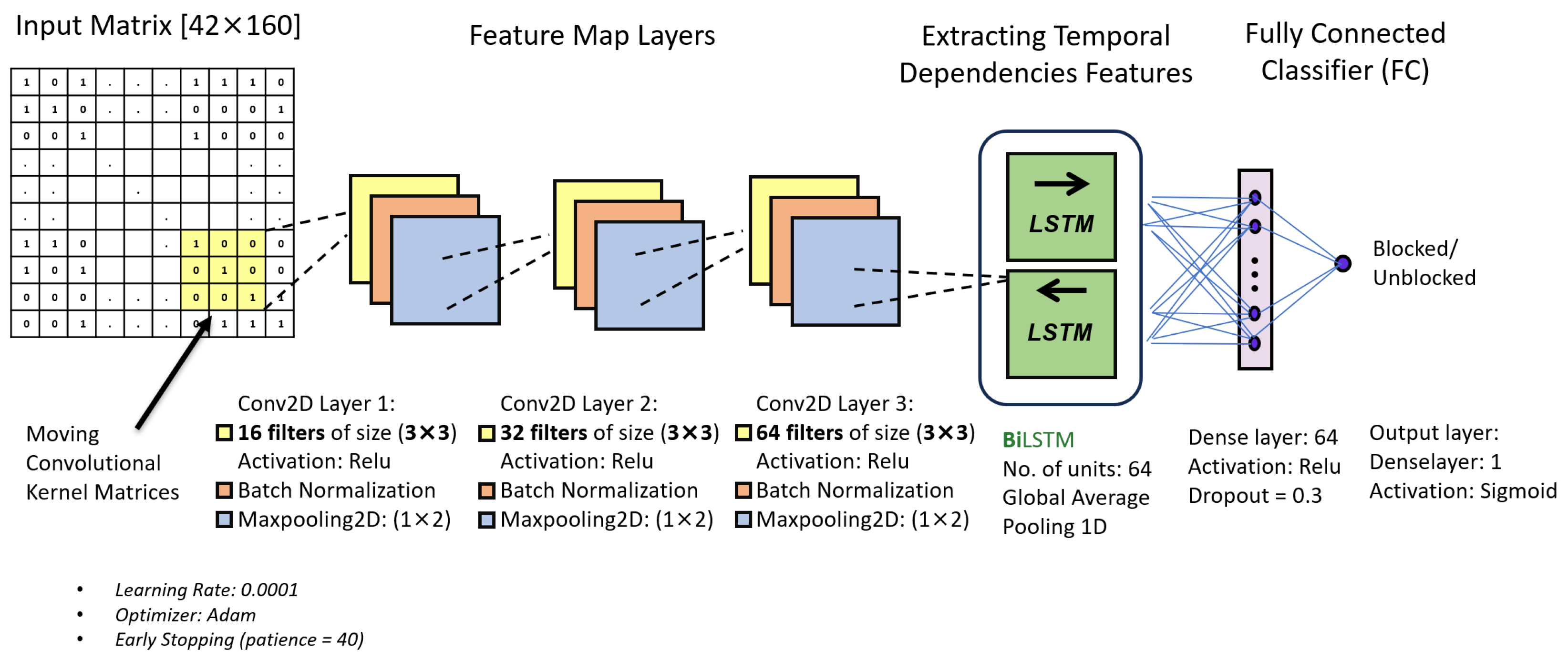 The two proposed architectures differ primarily in their CNN depth, recurrent structure, and fully connected layers. Algorithm 1 employs a lightweight CNN architecture, whereas Algorithm 2 utilizes a deeper CNN, impacting their spatial feature extraction capabilities. Additionally, Algorithm 1 incorporates a unidirectional LSTM for temporal modeling, while Algorithm 2 enhances temporal modeling by using a bidirectional LSTM (BiLSTM). Finally, Algorithm 1 uses a fully connected dense layer with 32 units for blocking prediction, whereas Algorithm 2 includes a larger dense layer with 64 units.