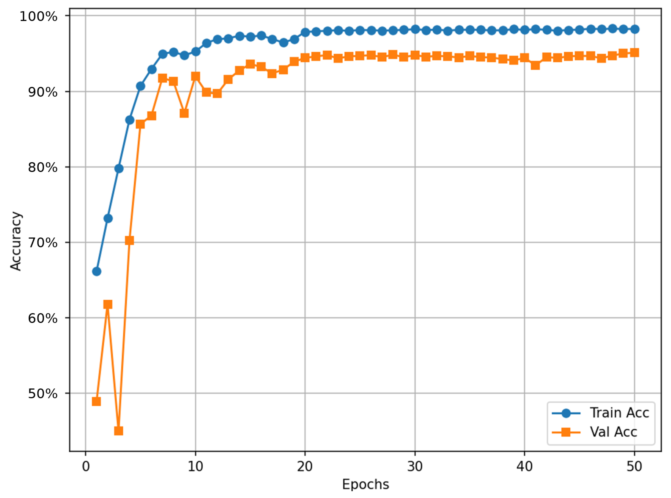 Figure 10 illustrates the training and validation accuracy curves for the CNN–LSTM model over 50 epochs, demonstrating the learning dynamics of the proposed architecture. The training accuracy rises rapidly during the initial epochs, reaching over 90% within the first 10 epochs and gradually converging near 98%. The validation accuracy also exhibits rapid initial improvement, stabilizing around 93%, slightly lower than the training accuracy.