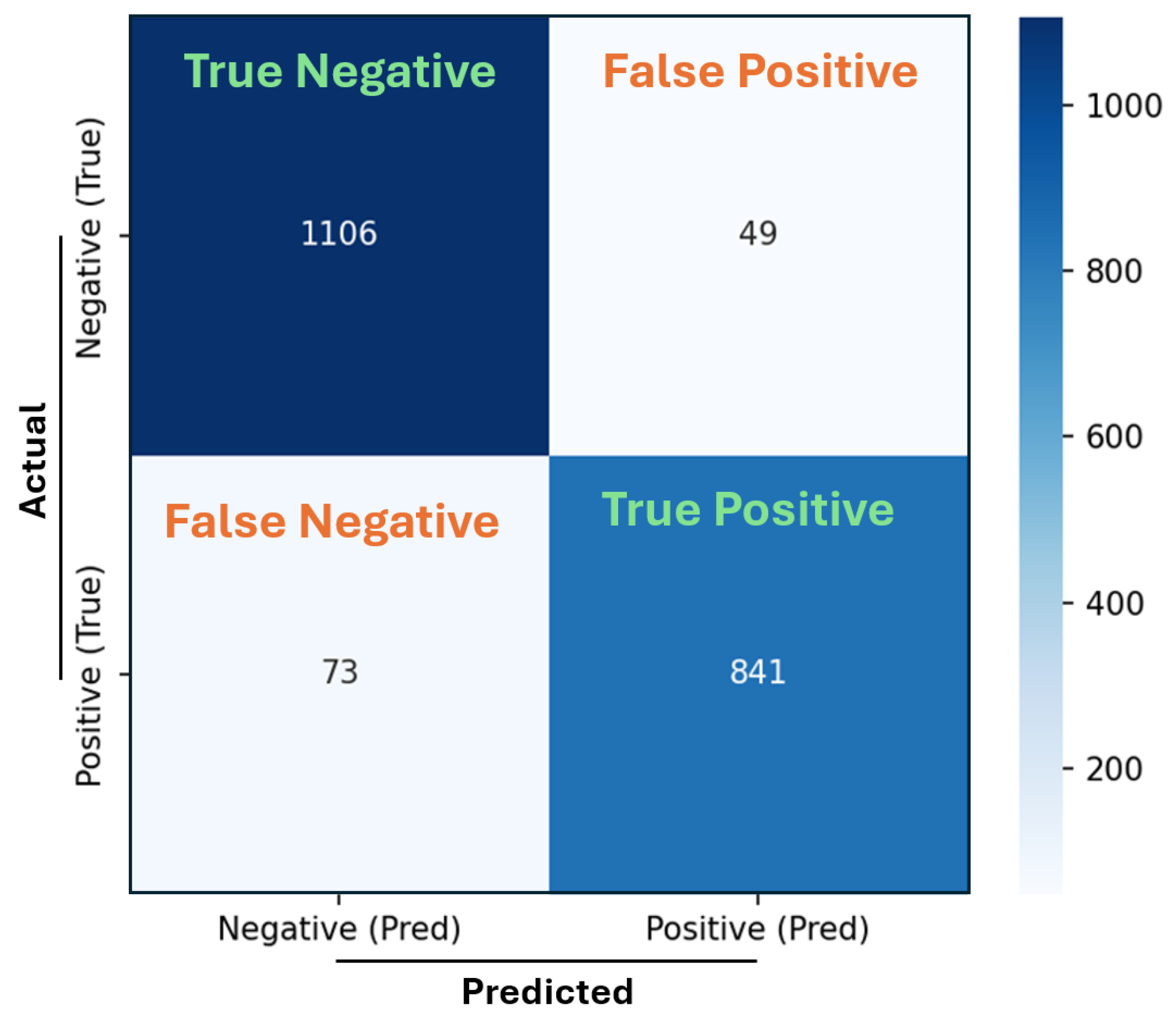 The confusion matrix is a table representation that summarizes the model’s classification performance across both classes: