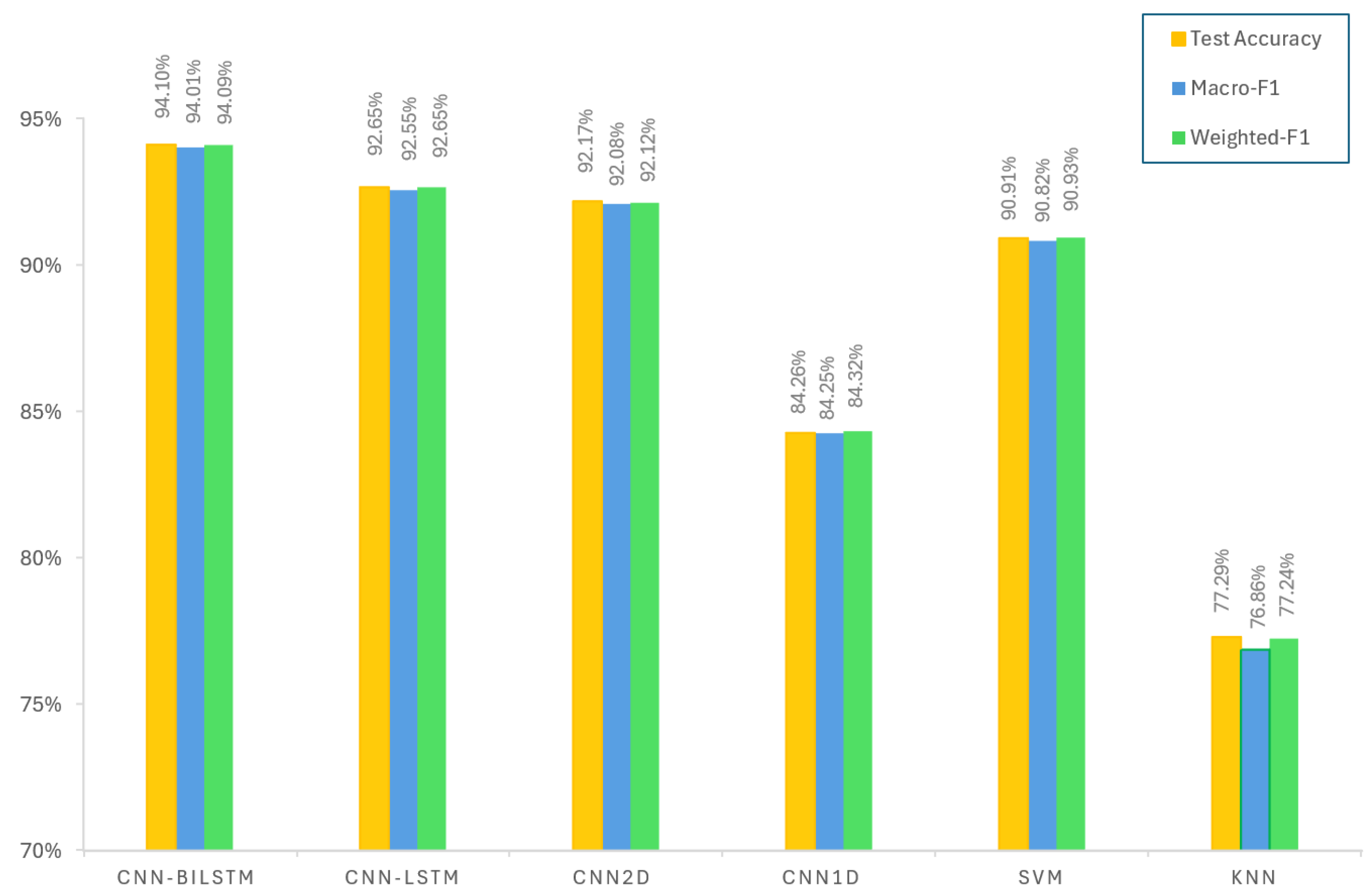 1] shows lower performance across all metrics compared to hybrid models and 2D CNNs, and it requires even more training time (135,960 s). The traditional machine learning models SVM and KNN have a lower performance than hybrid deep learning methods. KNN achieves the lowest accuracy (77.29%). These results show that the proposed hybrid CNN–BiLSTM model improves accuracy across different evaluation metrics.