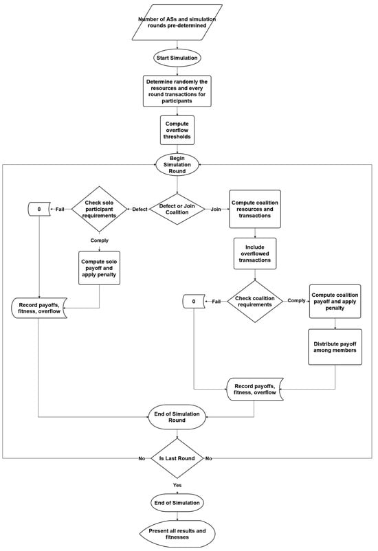These steps repeat for every simulation round. After completion, round-wise coalition, solo, and fitness payoffs are presented, alongside aggregated total fitness for each participant. Results for partial coalitions, including payoffs and fitness, are also reported, as well as transaction overflow per participant and coalition. The simulation workflow is illustrated in Figure 1.
