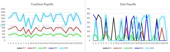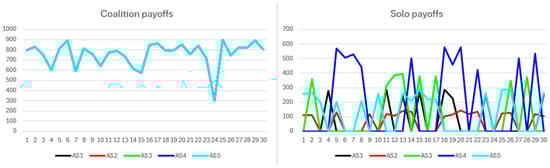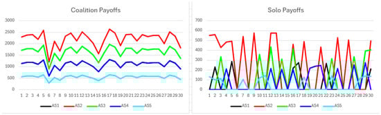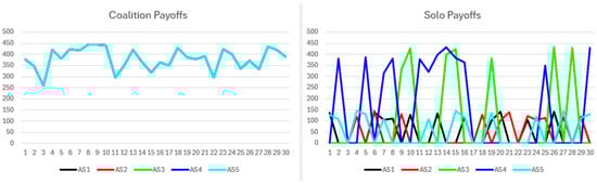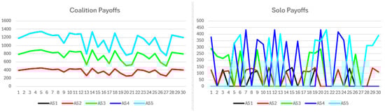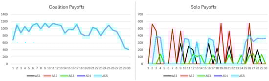 The simulation results begin with the short-term no-synergy scenario. Figure 12 presents coalition and solo payoffs. Coalition payoffs surpass solo payoffs and display smoother trajectories, reflecting the coalition’s capacity to deliver consistent benefits within a narrow range each round, thus reducing fluctuations. All coalition participants receive identical payoffs. Solo payoffs show greater variability, as non-cooperative participants do not earn payoffs every round. When awarded, solo payoffs fall within a limited range and scale proportionally with participant resources. The highest solo payoffs partially overlap with the lowest coalition payoffs, indicating relatively strong solo performance.