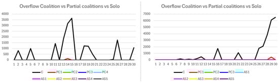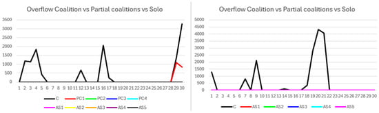 Transaction overflow data in Figure 14 reveal overflow exclusively within the coalition. A substantial overflow emerges in the final rounds, persisting until the simulation’s end without effective mitigation. This overflow adversely affects coalition payoffs and fitness, accounting for the observed decline. Nonetheless, the coalition’s strong prior performance ensures overall benefits remain superior to those of solo participants.