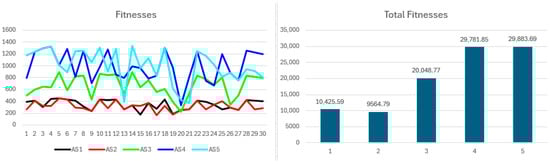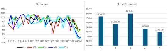Figure 11 presents fitness values differentiating coalition payoffs among participants. Due to similar coalition and solo payoffs, rounds with high solo payoffs produce fitness near zero, indicating a cancelation effect. Occasionally, fitness dips below zero when solo payoffs exceed coalition returns. Cumulative fitness mirrors payoff patterns, with participants bearing coalition performance burdens—typically those with greater resources—showing greater divergence. This is the first case where cooperation matches high-resource non-cooperation; total fitness confirms coalition robustness, as consistent coalition payoffs surpass episodic, inconsistent solo gains. However, uniform coalition payoffs favor low-resource participants and limit high-resource returns, equalizing payoffs and aligning them with solo outcomes. Scenarios with more high-resource participants would likely amplify differences between coalition and solo payoffs.