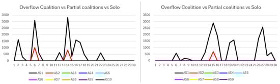 A maximum transaction processing capacity per round is defined (between 288 and 3000 transactions), accounting for resource limits and average transaction sizes, informed by blockchain hardware and infrastructure studies [,,] and empirical benchmarks. Excess transactions overflow into subsequent rounds, potentially accumulating if demand remains high. The maximum theoretical processing capacity in optimal conditions is 5760 transactions per round. For individual ASs, an overflow threshold of 2880 transactions is set. For coalitions, the threshold scales with coalition size, average resources, and resource distribution; for example, a coalition of five ASs has a threshold of 9000 transactions. Transactions exceeding these thresholds carry over as overflow.