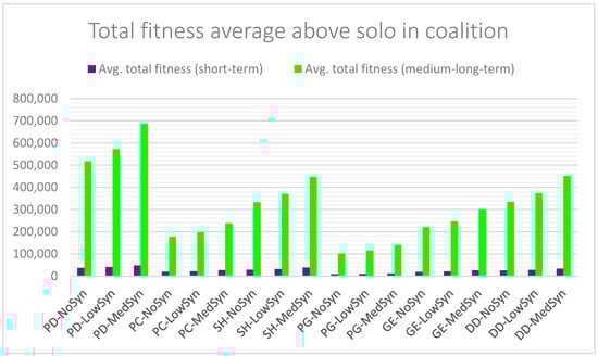 To provide a more concrete understanding of the results, the average total fitness per game was aggregated and is presented in Figure 17, highlighting the advantages of cooperation over independent action. The figure illustrates the additional gains achieved through coalition formation, measured relative to the benefits obtained by acting independently. Average gains were calculated for each game across the first three synergy levels, considering both short-term and medium-to-long-term scenarios. The results consistently show that coalitions outperform independent strategies under all conditions, with higher synergy levels further amplifying cooperative benefits. These advantages become even more pronounced in the medium-to-long-term simulations, where the performance gap between coalition and independent outcomes increases substantially in favor of cooperation.