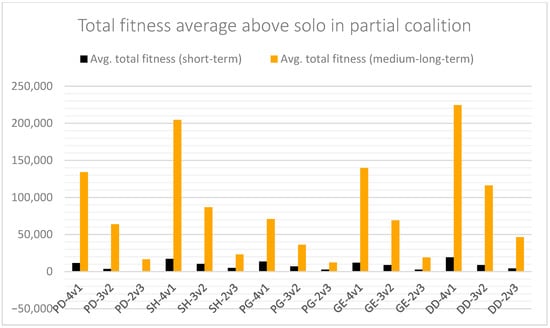 The results strongly confirm the quantitative superiority of cooperation over independent action. On average across all games, coalitions achieved a total fitness that was 26,592 points higher in the short term, corresponding to a substantial relative improvement, and 323,444 points higher in the medium-to-long term, representing an even greater proportional gain as cooperation effects accumulate. Partial coalitions also delivered consistent advantages, outperforming independent strategies by 8362 points in the short term and by 84,199 points in the medium-to-long term, again reflecting significant relative improvements in overall fitness. While some isolated cases were observed—such as specific scenarios in which coalition outcomes were low or even negative—these exceptions were rare and did not alter the overall pattern. The comprehensive set of simulations demonstrated that, both in the short and medium-to-long term, coalition strategies consistently outperformed independent action. Even partial coalitions, despite occasional isolated underperformances, ultimately proved more effective and reliable, achieving better results across nearly all cases. These findings demonstrate not only the immediate but also the compounding long-term benefits of coalition strategies and provide robust evidence that cooperative behavior, whether embraced by all or only a subset of participants, is the most effective and beneficial strategy for federations integrating resource-intensive technologies.