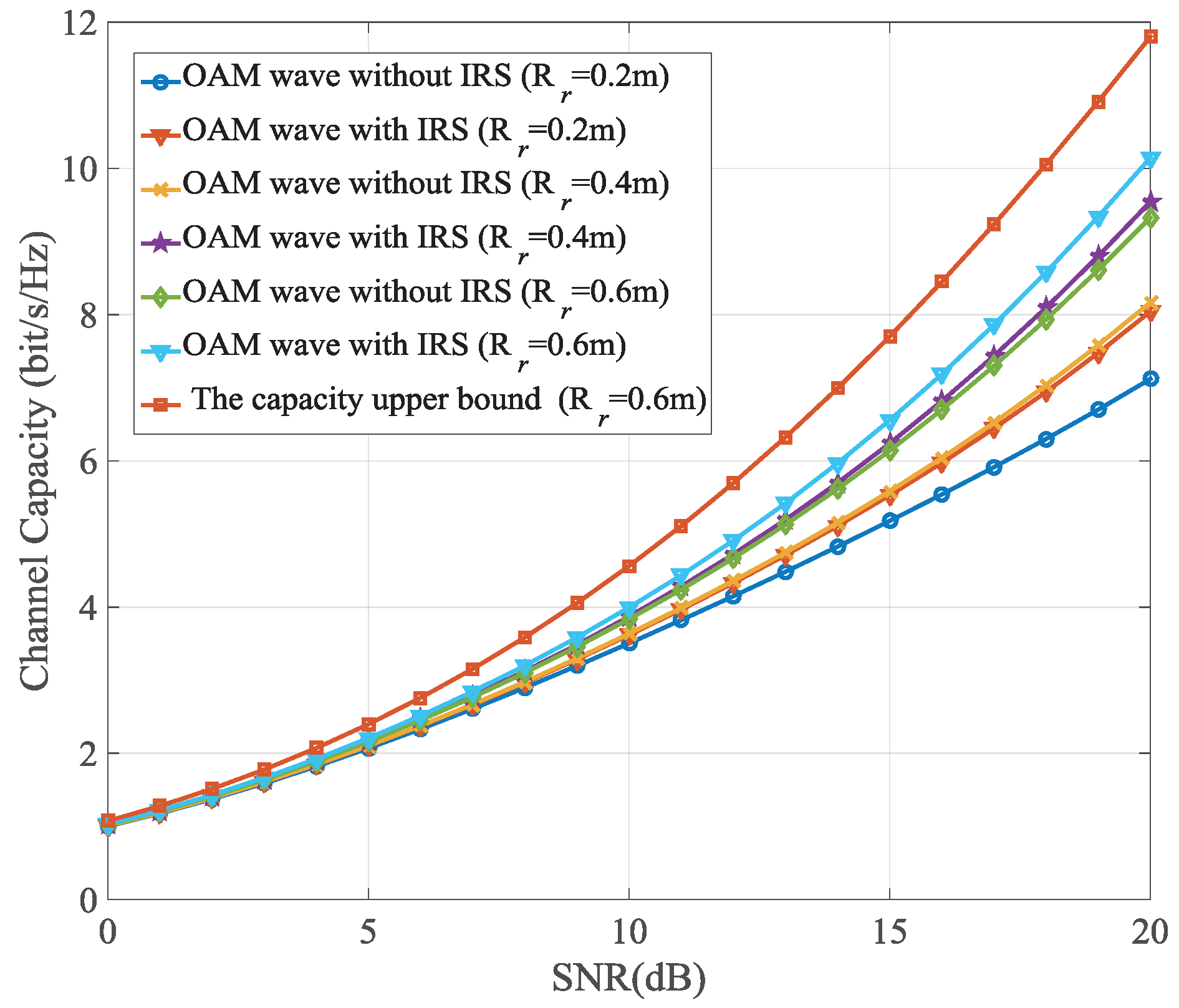 - The convergence performance of an IRS with OAM is verified through simulations. Further, it is demonstrated that the IRS can achieve performance gains in improving the channel capacity of the OAM transmission system and reducing the receiver size.