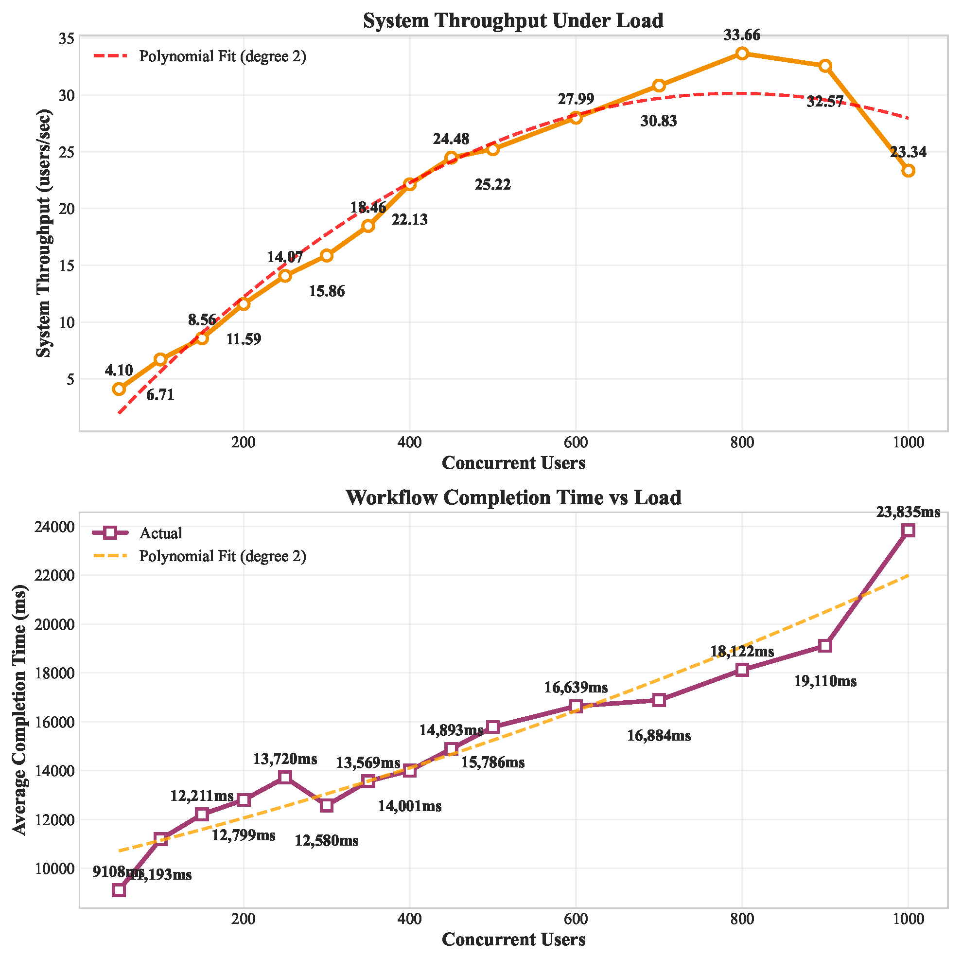 System throughput follows a polynomial curve, peaking at 33.66 users/sec at 800 concurrent users before declining to 23.34 users/s at 1000 users. This indicates optimal operating capacity around 700–800 concurrent users. Notice that the simulation testbed poses limitations, such as the maximum number of acceptable connections on the experimental HTTP server and the limited number of cores available on the test machine.