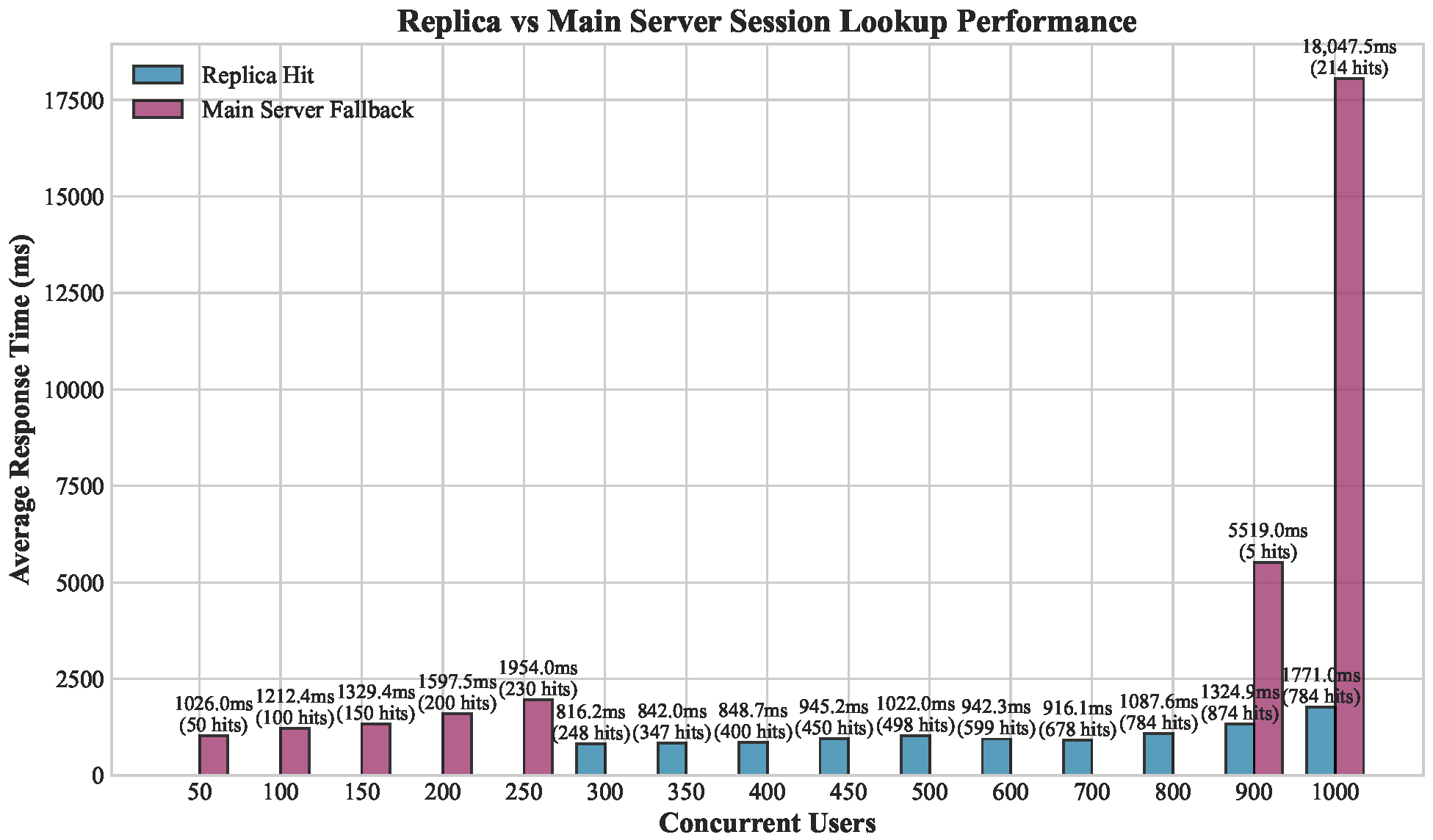 Figure 3 demonstrates the critical performance difference between replica hits and main server fallback operations. When session data are successfully retrieved from replica servers, response times remain consistently low (816–1329 ms) on moderate user loads. However, when replica synchronization fails, forcing fallback to the main server, response times increase dramatically (5519–18,047 ms), representing a 3–10x performance penalty. This result suggests the efficacy of the distributed cache mechanism compared to centralized session validation queries.