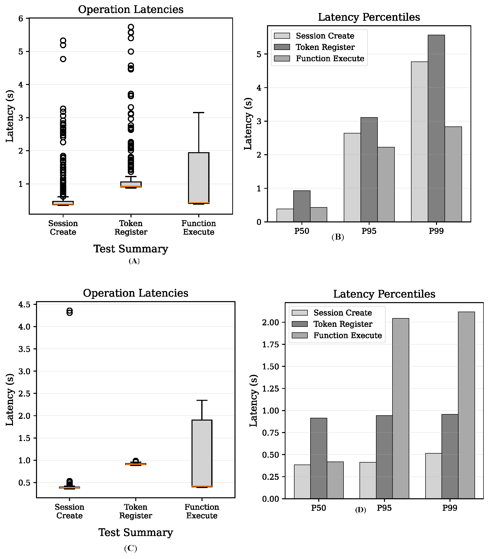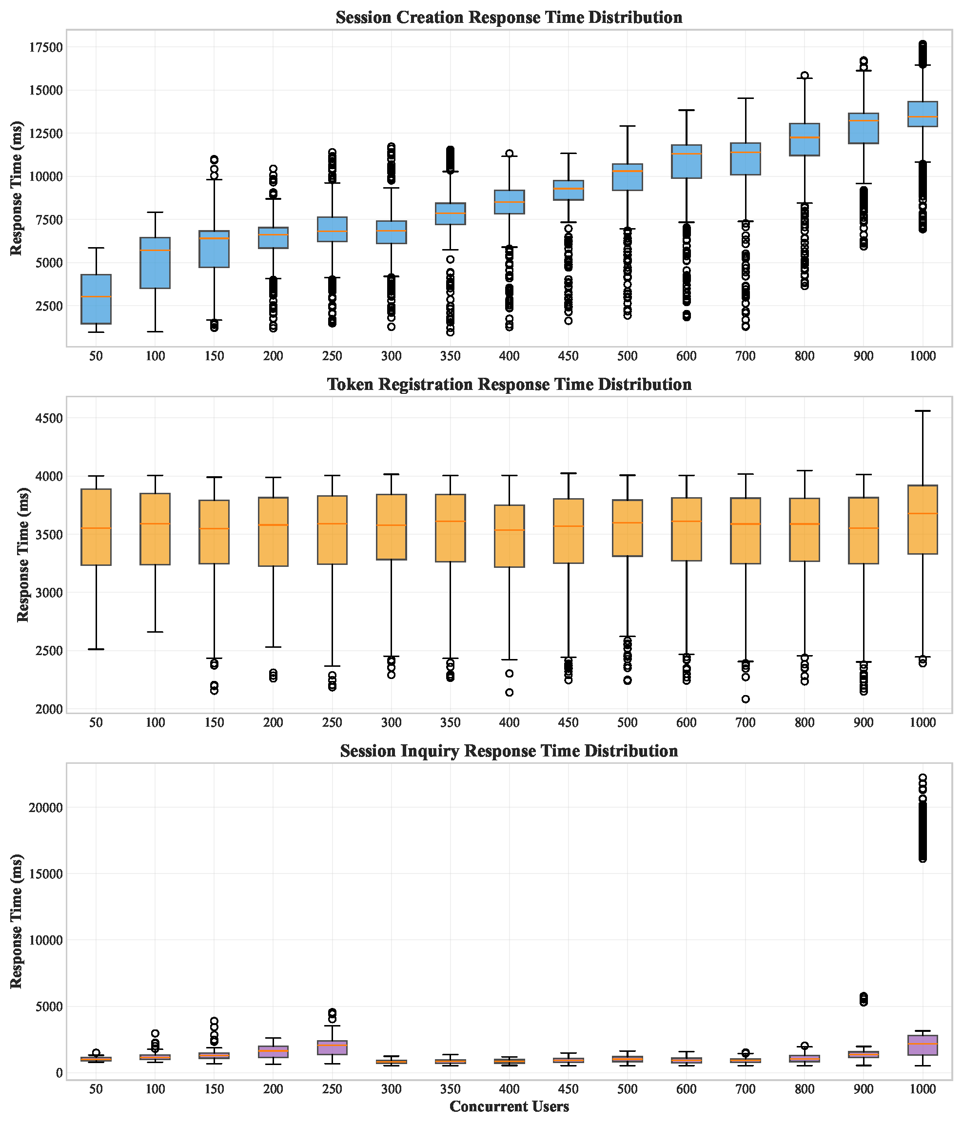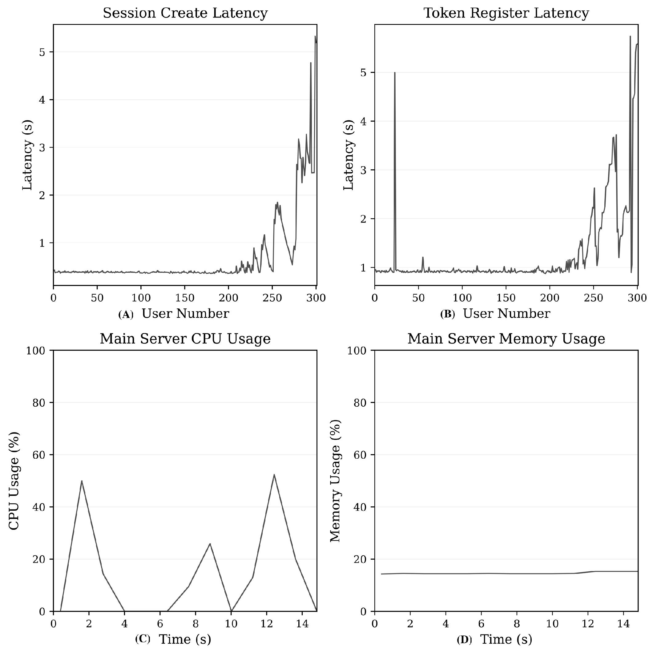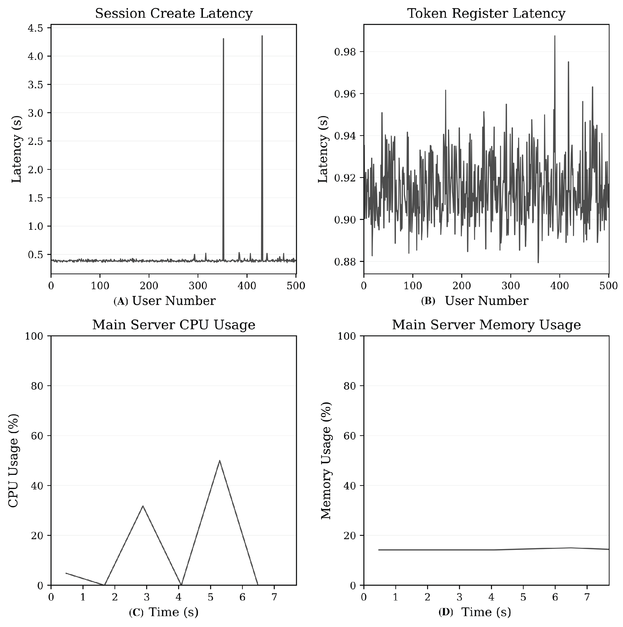 Comparing linear versus exponential arrival patterns reveals distinct performance characteristics. Linear arrival exhibits stable behavior with a mean token registration latency of 914.5 ms, a mean token query latency of 847.3 ms, and a 72.2% cache hit rate. Exponential arrival, simulating burst traffic, degrades performance substantially. Mean token registration latency increases 38% to 1261.7 ms, while session creation P95 latency reaches 2639.2 ms, indicating a 6.4-fold decrease from linear’s 414.3 ms. The cache hit rate drops slightly to 69.0%, indicating that burst traffic temporarily overwhelms replica synchronization. Despite these degradations, CPU and memory metrics confirm the system handles both patterns without resource exhaustion. Notice that the machines used in the experiments have limited resources. The machines did not execute any other user-defined tasks during the experiments.