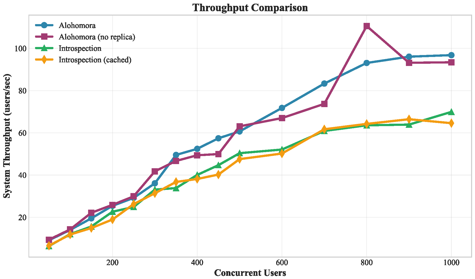 Alohomora (both variants) exhibits consistent linear scaling. This shows an effective load distribution through the replica architecture. Introspection systems show similar scaling patterns. The lack of significant differences between cached and non-cached variants in the introspection server suggests that caching overhead may offset cache benefits under high concurrency.