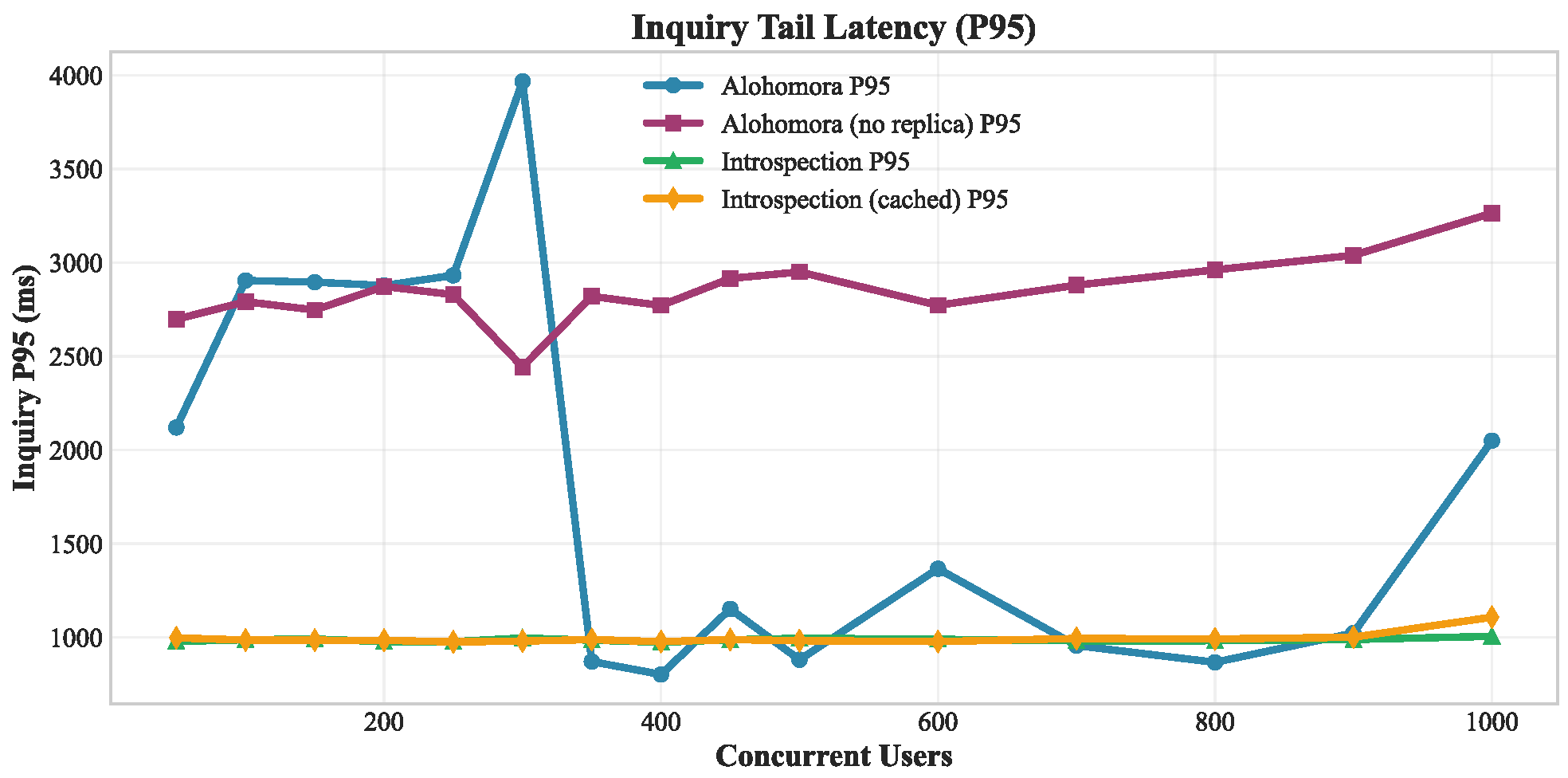 Figure 6) reveals critical system stability differences. Alohomora Standard exhibits extreme variability with a severe spike to 4000 ms at 300 users, followed by recovery and relatively stable performance (900–2000 ms) across higher loads. This suggests an initial replica synchronization stress that resolves as the system stabilizes. Alohomora (without cache) maintains consistently high P95 latency (2700–3300 ms) across all loads, demonstrating the latency cost of direct main server access. Introspection systems maintain exceptional latency stability at approximately 1000 ms P95 across all load levels, demonstrating the predictability advantage of centralized OAuth processing.