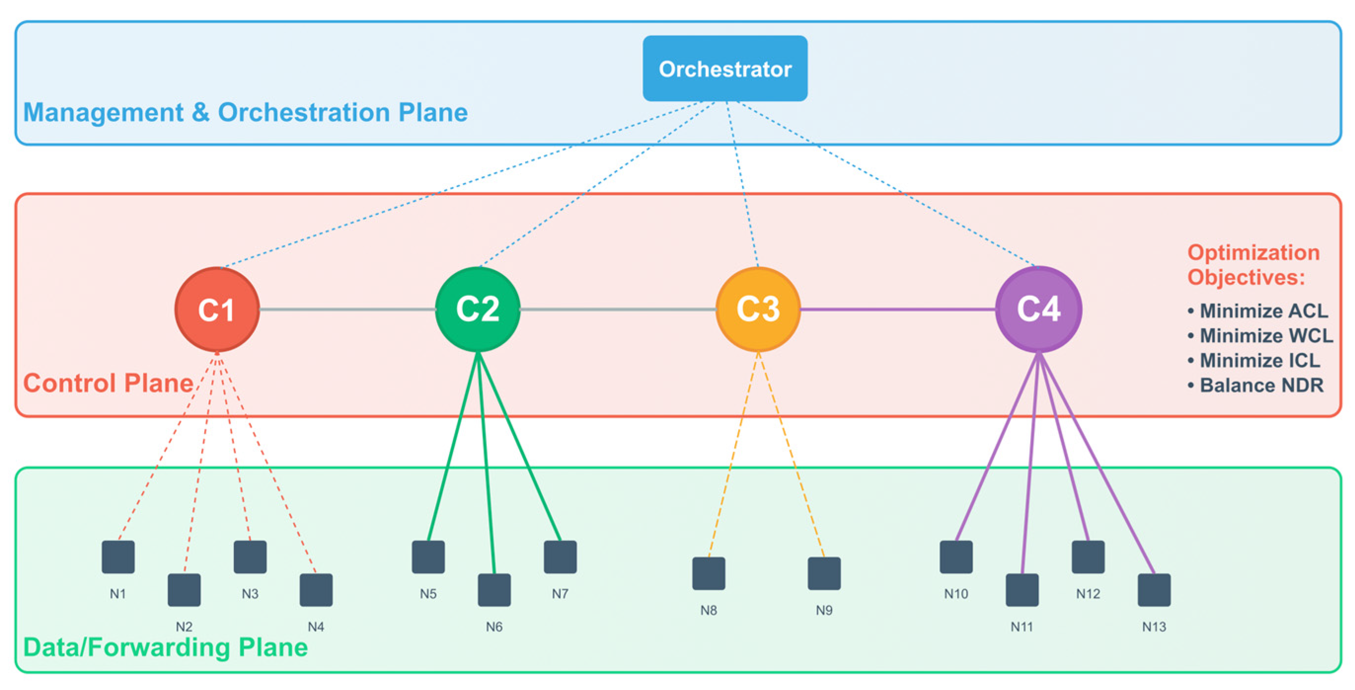 - Average Control Latency (ACL): quantifies the mean communication delay within controller domains, serving as a primary indicator of network responsiveness, as in (8):