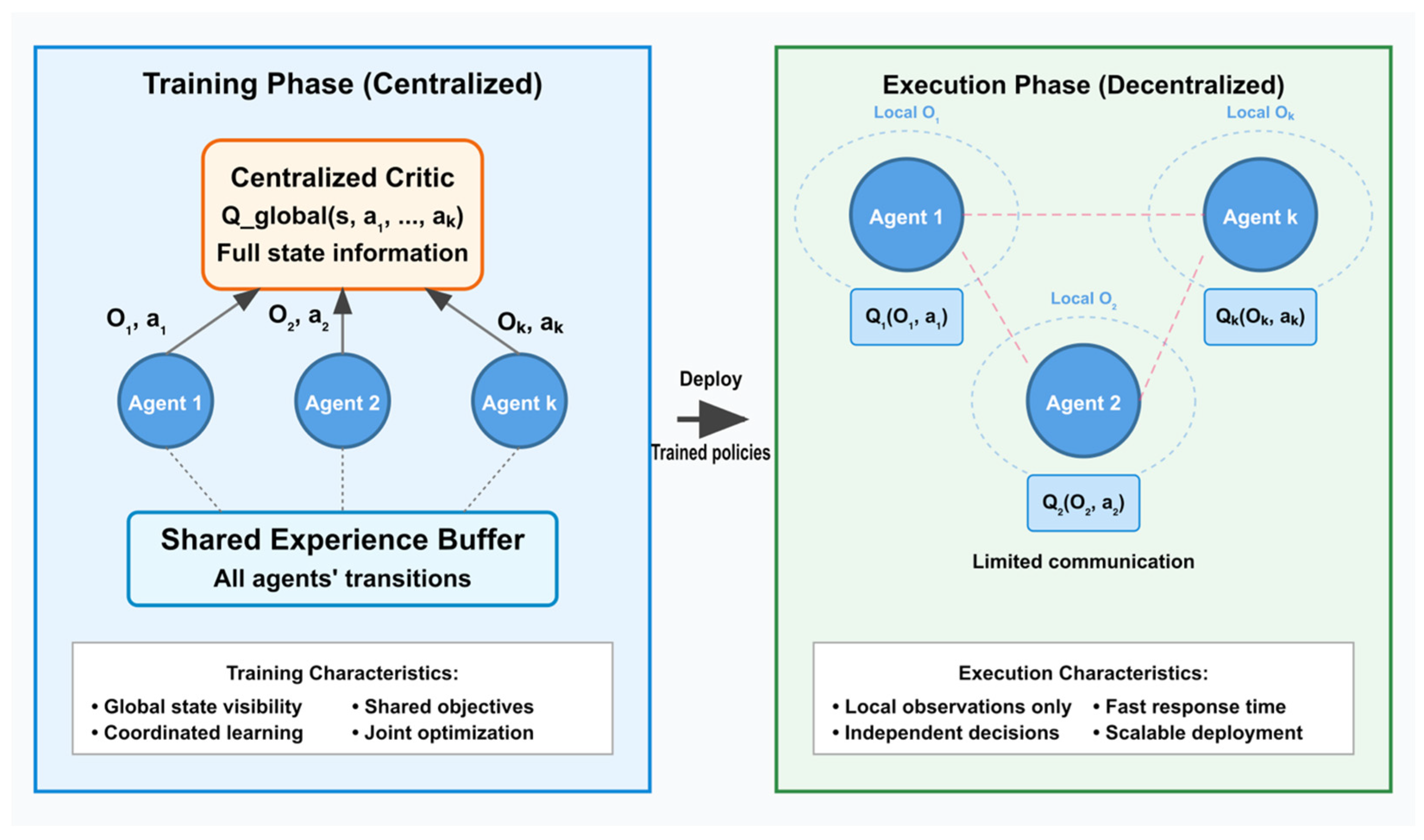 - Scalable Distributed Learning: The CTDE-based MARL implementation enables distributed optimization that scales linearly with network size while maintaining cooperative behaviour between agents.