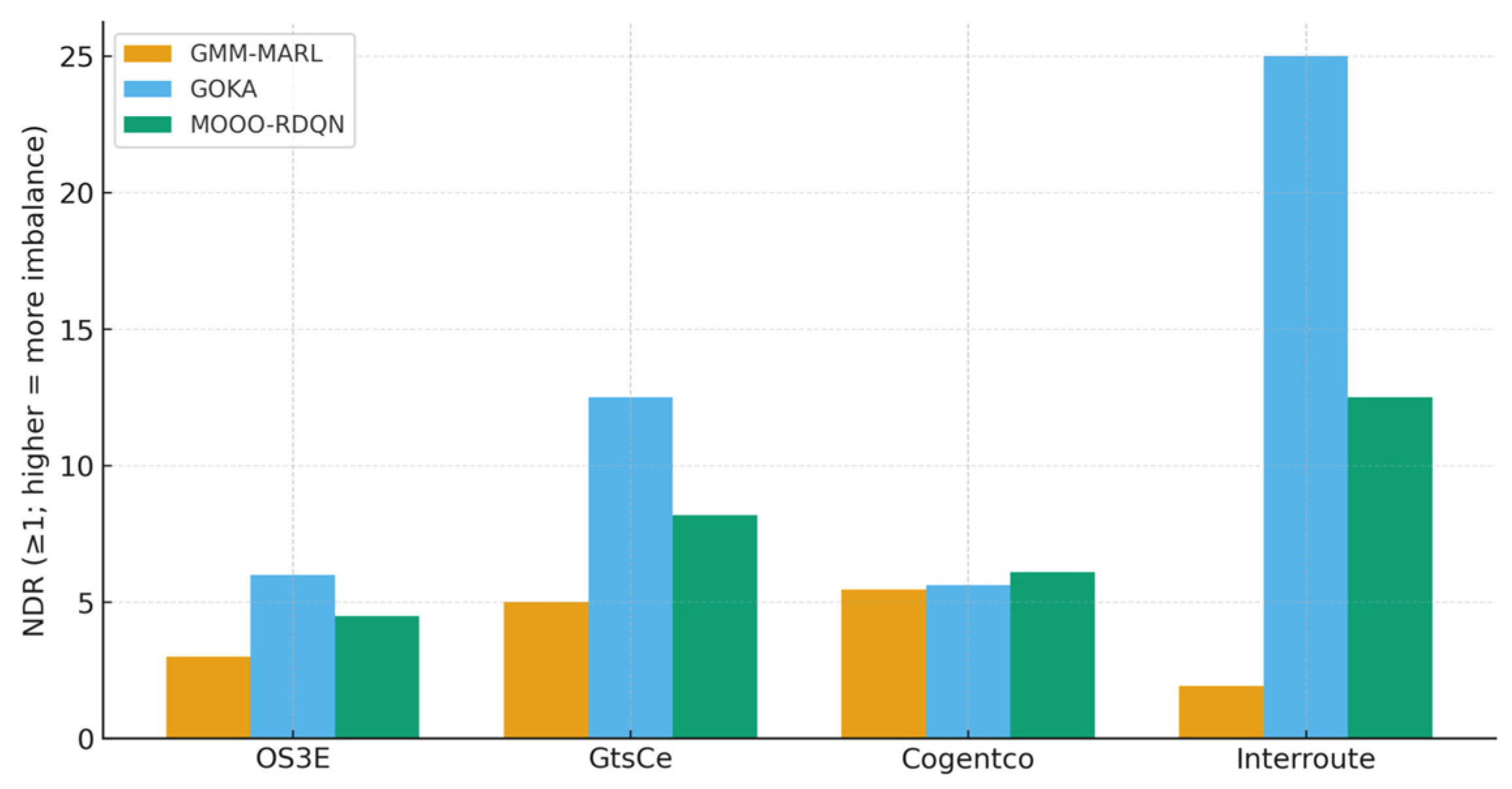 - Scalability Through Decomposition: The hybrid architecture achieves scalability through problem decomposition; GMM handles spatial clustering with complexity, while MARL agents operate on reduced state spaces with interaction complexity, where . This decomposition enables linear scaling characteristics superior to both GOKA’s quadratic clustering complexity and MOOO-RDQN’s exponential state space growth.