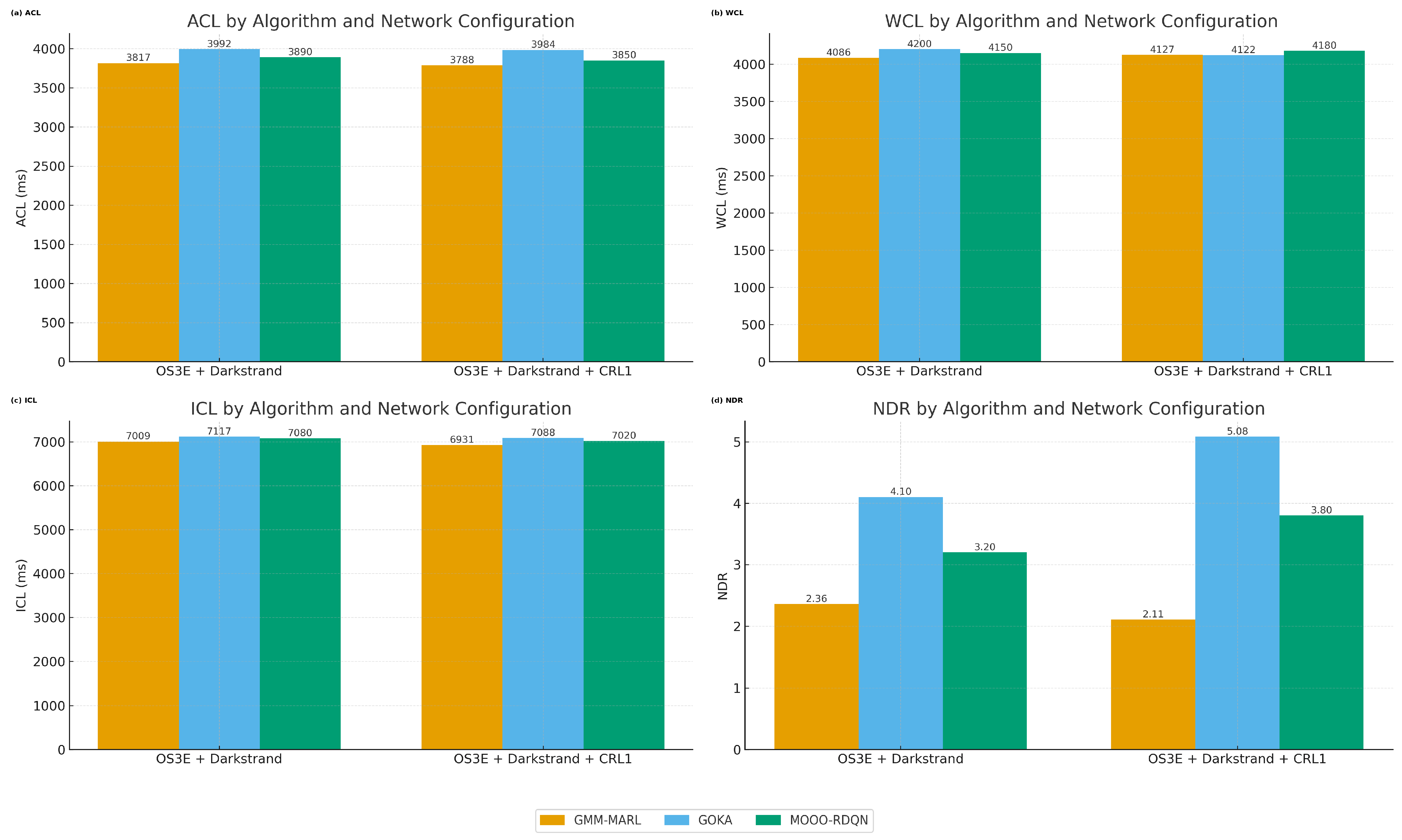 | Network Configuration | Algorithm | ACL (ms) | WCL (ms) | ICL (ms) | NDR |