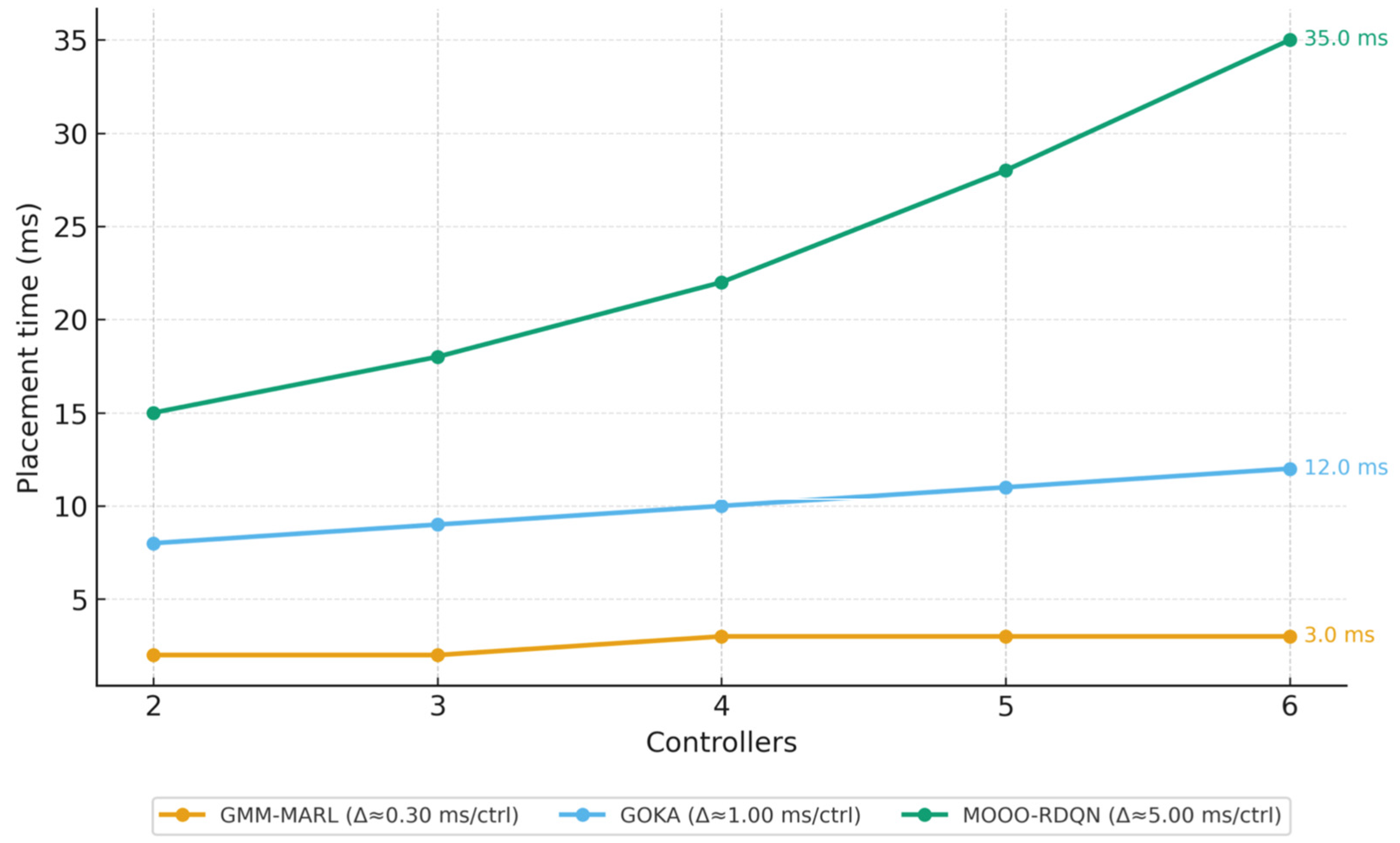 - Initialization Problem Resolution: Traditional RL approaches suffer from the cold start problem, requiring extensive exploration to discover viable controller placement strategies. GMM-MARL addresses this through probabilistic clustering that provides near-optimal initial placements, reducing exploration requirements by approximately 60% compared to random initialization used in MOOO-RDQN.