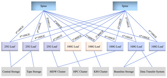 A key design feature of the RoCE-based spine–leaf architecture for the HEPS data center is that there are no direct interconnections between spine nodes in the current deployment. This spine-disjoint topology simplifies the core layer structure while laying a flexible foundation for bandwidth expansion. The initial architecture deploys two spine switches to interconnect with eight leaf switches, which is sufficient to support the data transmission demands of 15 beamlines in HEPS Phase I.