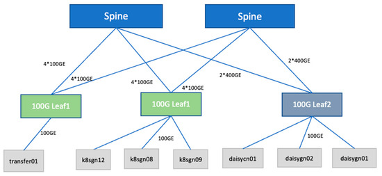 We designed a spine–leaf architecture consisting of two spine switches and eight leaf switches, with 25G and 100G Ethernet connections deployed to accommodate diverse bandwidth requirements [6], as illustrated in Figure 1. The access-layer gateway functions are deployed on leaf nodes, which reduces latency and optimizes traffic routing between compute/storage resources and the core network. Between the spine and leaf layers, dynamic routing protocols enable adaptive path establishment, while Equal-Cost Multipath (ECMP) distributes traffic across redundant links, ensuring load balancing, maximizing throughput, and enhancing fault tolerance. This architecture enables scalability for data-intensive applications including AI training, HPC, and real-time analytics.