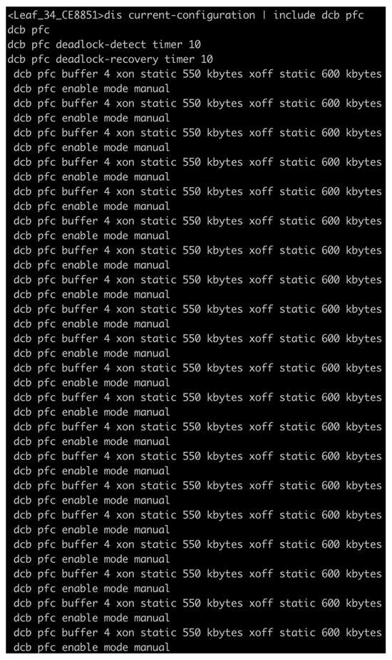 We use the default ECMP hash algorithm. The PFC function is globally enabled (seen in Figure 3), complemented by a 10 s deadlock detection timer and a 10 s deadlock recovery timer to proactively mitigate potential queue stagnation. Across multiple physical interfaces, a consistent manual PFC mode is configured, with exclusive activation in queue 4, designated for loss-sensitive traffic. The queue’s buffer thresholds are statically set, with the xon threshold (triggering transmission resumption) set at 550 kbytes and the xoff threshold (initiating pause frame sending) set at 600 kbytes. This setup ensures that when the queue’s buffer utilization hits 600 kbytes, the switch sends PFC pause frames to the upstream device to prevent packet loss. Meanwhile, transmission resumes automatically once the buffer usage drops to 550 kbytes.