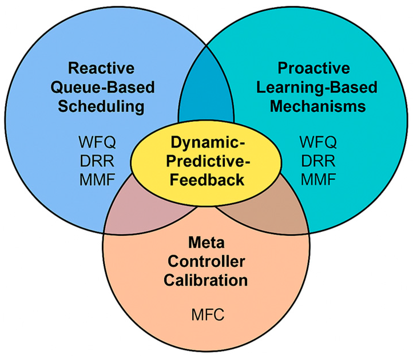 In summary, WFQ, DRR, and MMF represent powerful but mostly static control mechanisms. They are not designed to exploit real-time telemetry or machine learning predictions, which limits their ability to handle non-stationary, multi-scale traffic characteristic of SDN-based 6G and IoT deployments [