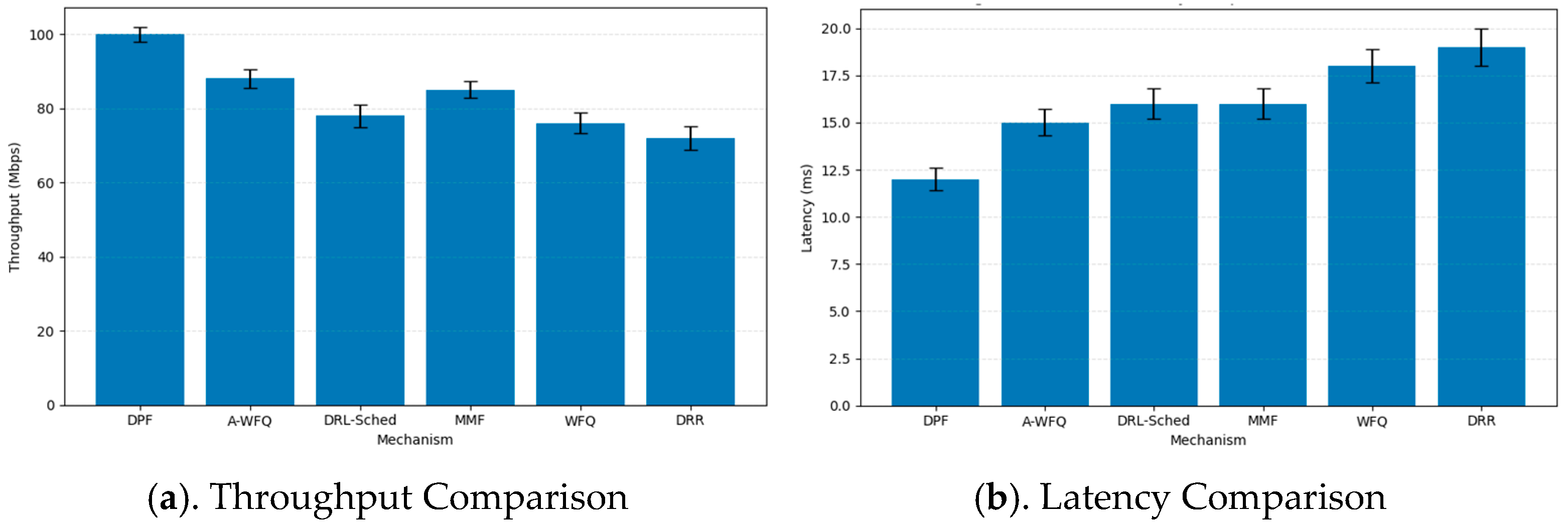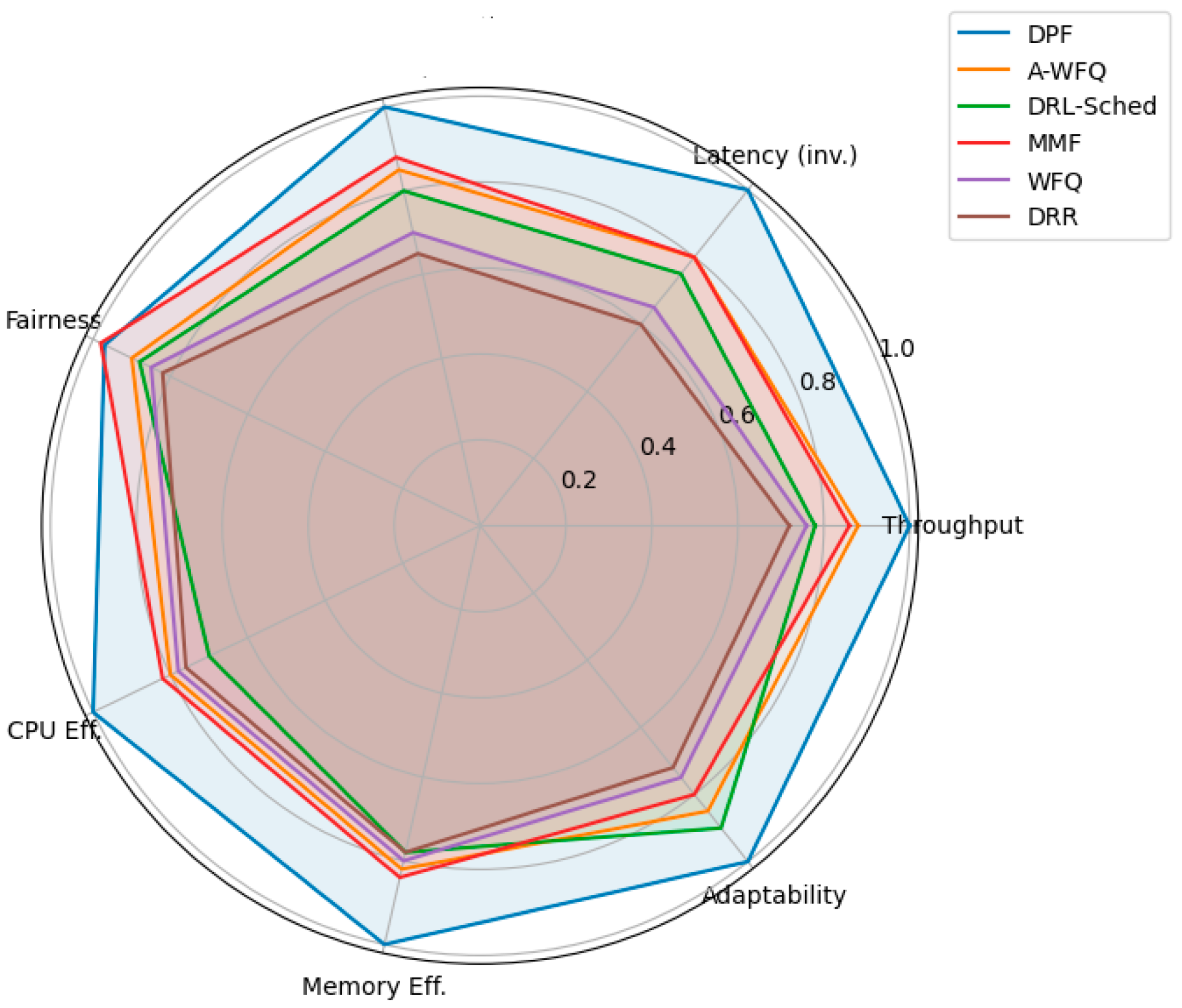 Figure 4 illustrates the overall performance comparison of DPF, WFQ, DRR, MMF, A-WFQ and DRL-Sched across key metrics. The results show that DPF consistently outperforms the other mechanisms in throughput, latency, and adaptability.