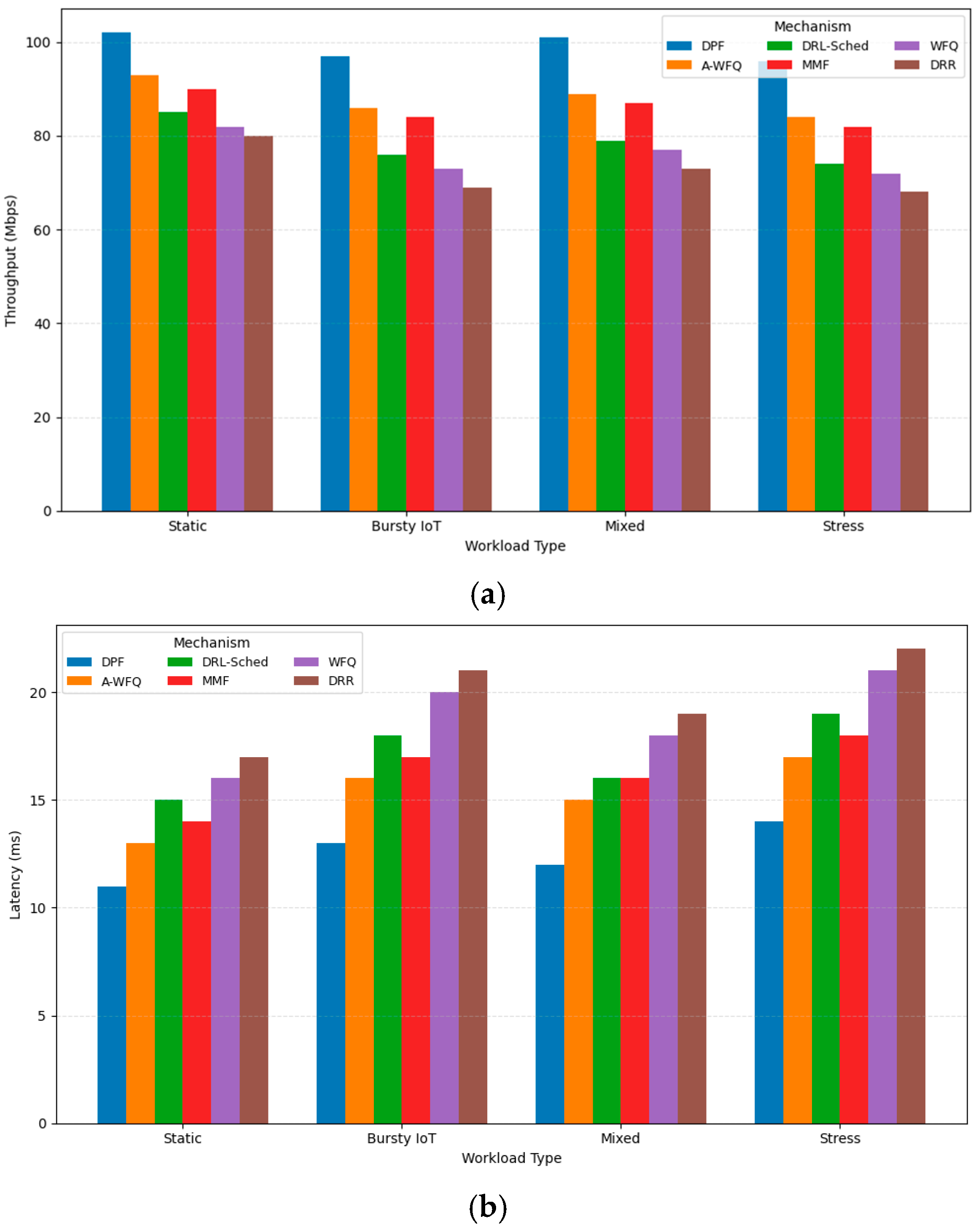 Figure 5b), DPF demonstrates a significant reduction in mean end-to-end delay, particularly under highly variable bursty and stress conditions. Compared to WFQ and DRR, latency is reduced by 30–40%, while achieving 18–22% improvement relative to A-WFQ and DRL-based scheduling. The reduced delay variations indicate that DPF effectively suppresses transient congestion spikes by adjusting meta-control weights in near real-time.
