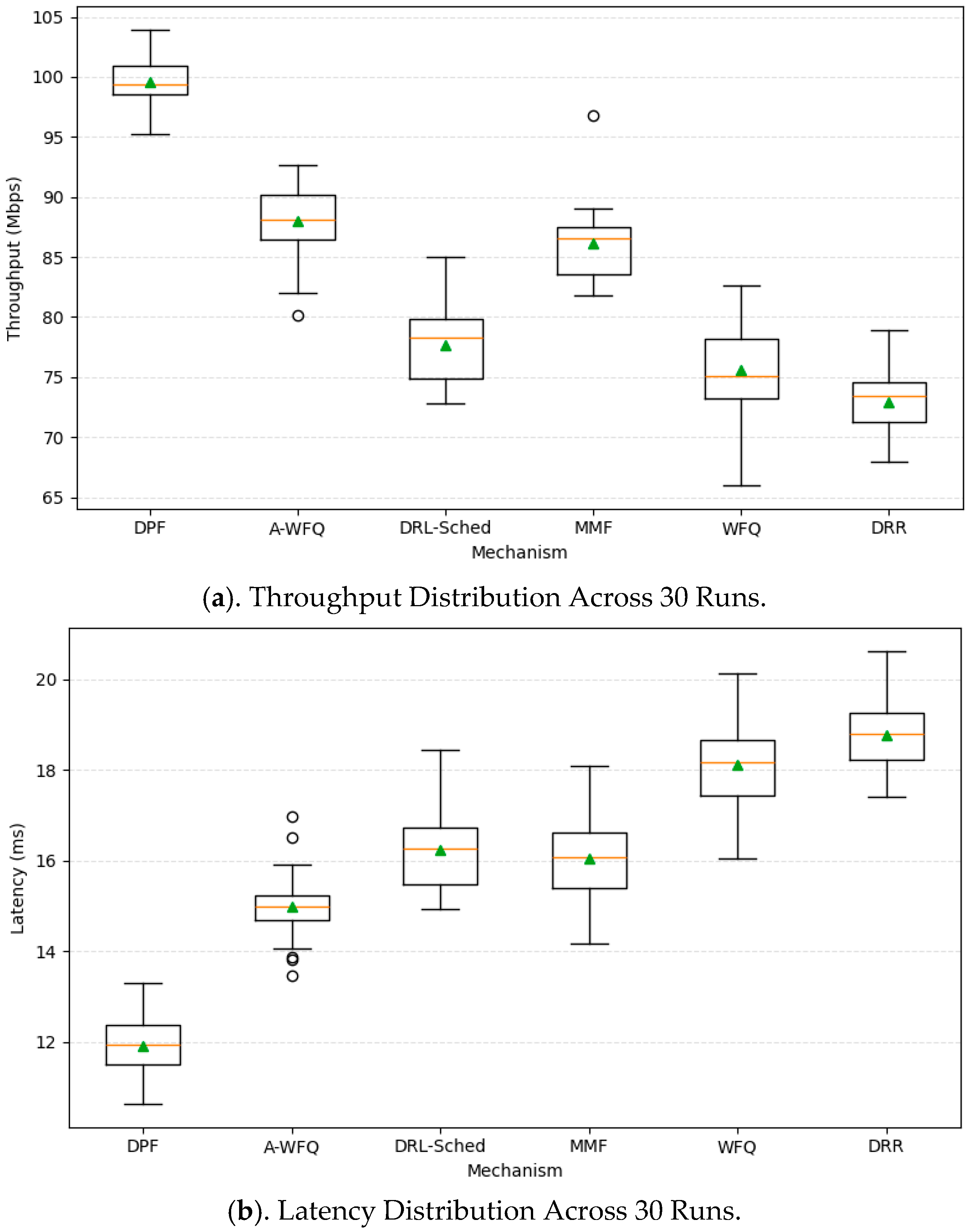 Figure 6, DPF achieves the highest median throughput (≈100 Mbps) while maintaining the lowest delay variance among the benchmarked schedulers. Compared with conventional queue-based mechanisms such as WFQ and DRR, DPF improves throughput by 24–32% and reduces end-to-end latency by 30–40%, attributed to its predictive congestion avoidance and adaptive meta-control. When compared to modern dynamic schemes including A-WFQ and DRL-Sched, DPF still outperforms with 13–16% higher throughput and 18–22% lower latency, indicating practical robustness across mixed and bursty traffic conditions.