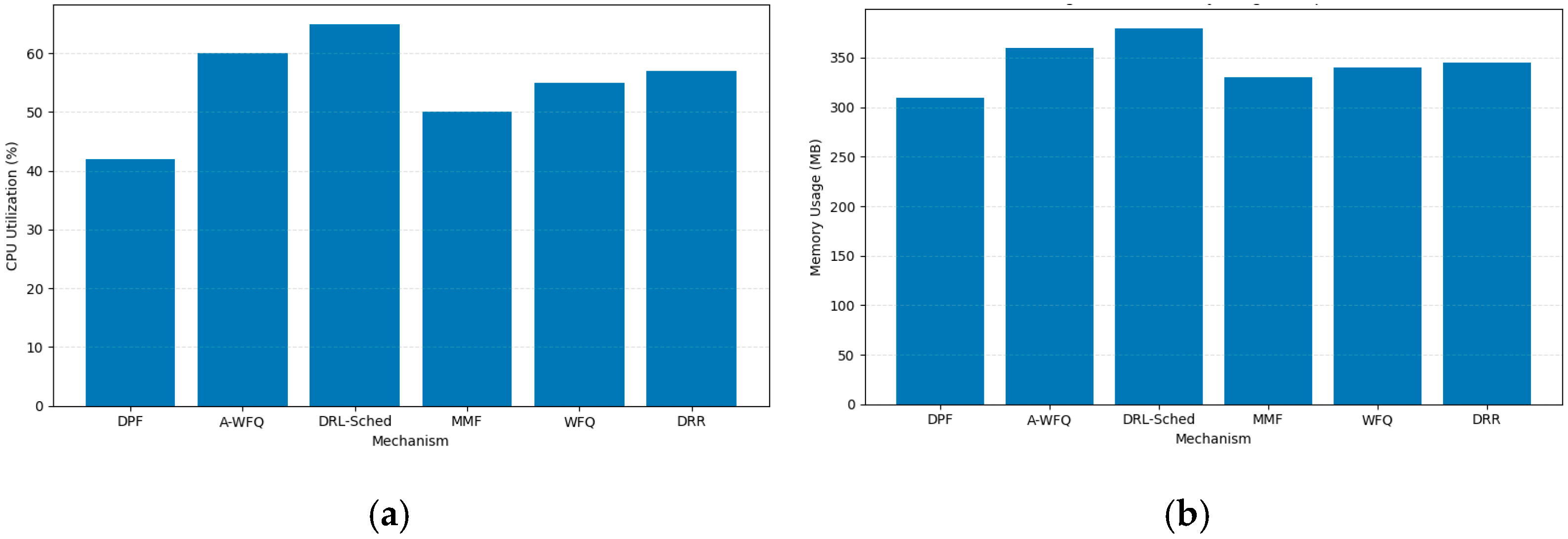 Figure 8a, DPF achieves the lowest CPU utilization among the six evaluated mechanisms. Compared to conventional WFQ and DRR schemes, CPU usage is reduced by 10–12%, due to the sparse telemetry sampling and incremental control updates that avoid heavy periodic recomputation. Even when compared to dynamic mechanisms including A-WFQ and DRL-Sched, DPF demonstrates 8–10% improved processing efficiency, confirming its lightweight execution footprint.