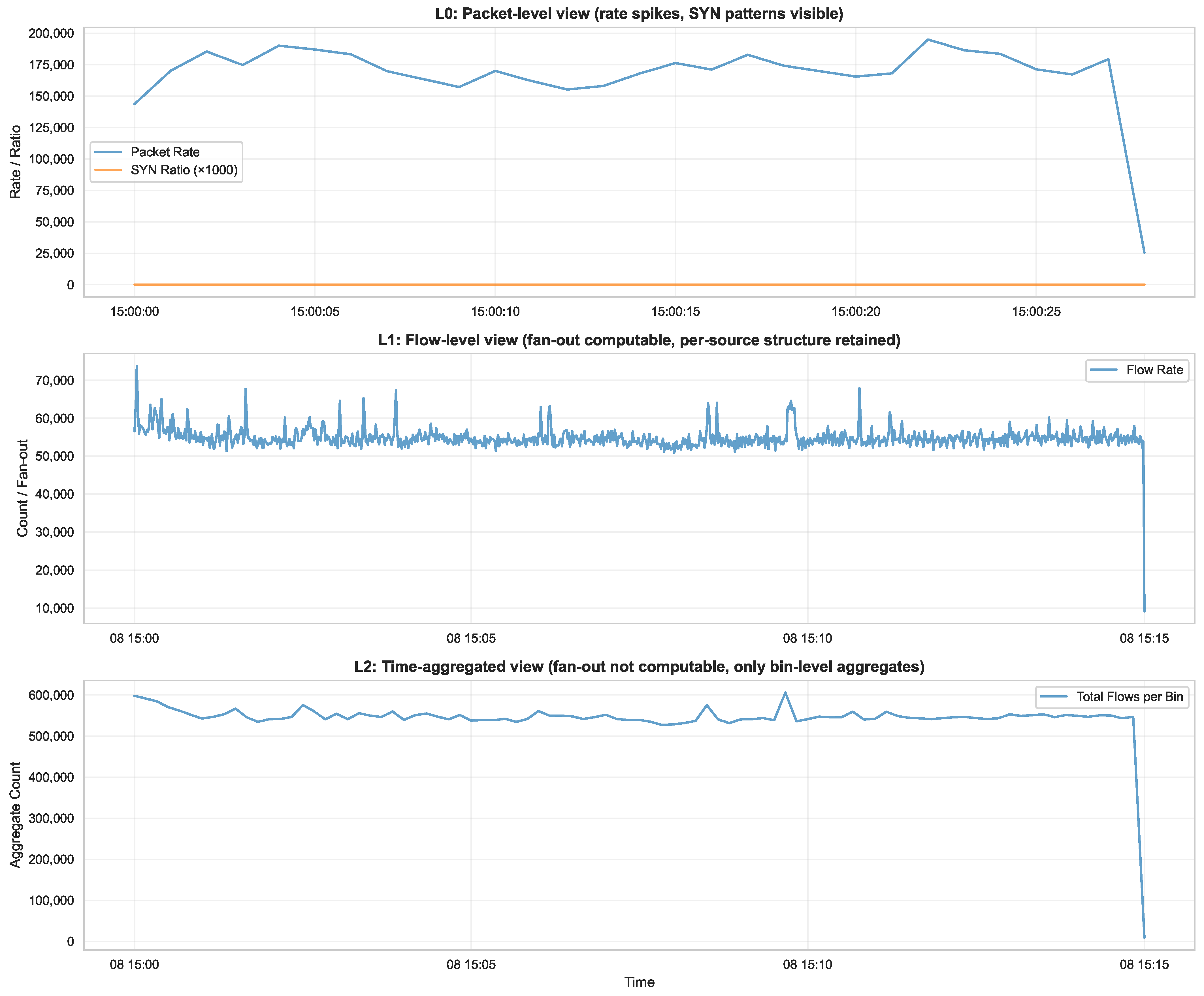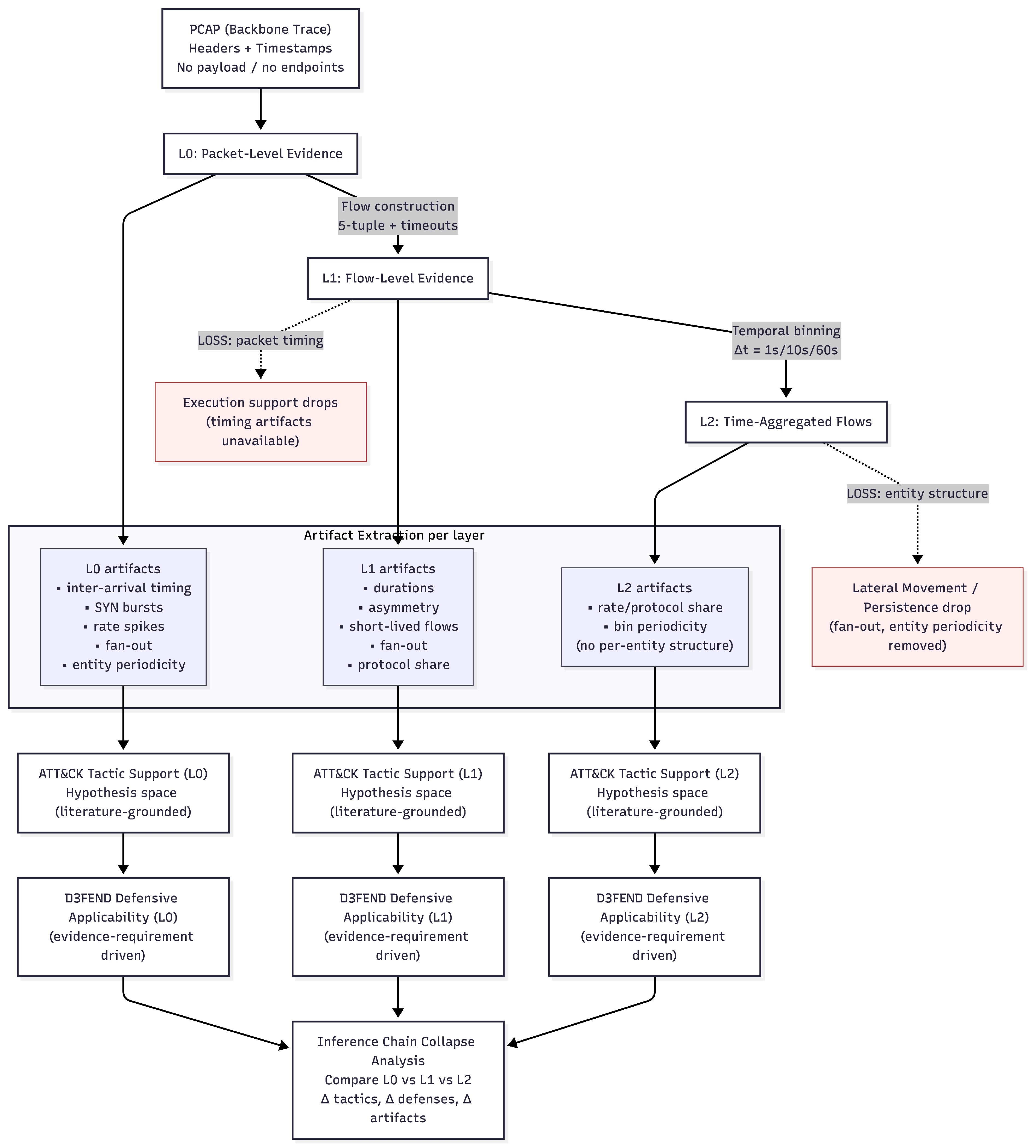 At L0 (packet-level), a responder can observe fine-grained timing patterns (inter-packet intervals, burst dynamics) and flag-level detail (SYN ratios), enabling support for Reconnaissance, Discovery, and Initial Access tactics with high evidential strength. At L1 (flow-level), destination fan-out becomes directly computable per source, preserving the ability to support Lateral Movement inference while losing packet-level timing texture. At L2 (time-aggregated), destination fan-out is no longer computable because temporal aggregation removes per-source keyed structure; only bin-level aggregate counts (total flows, rates) remain. This collapse eliminates support for Lateral Movement while preserving support for Reconnaissance and Discovery via SYN patterns and protocol statistics.