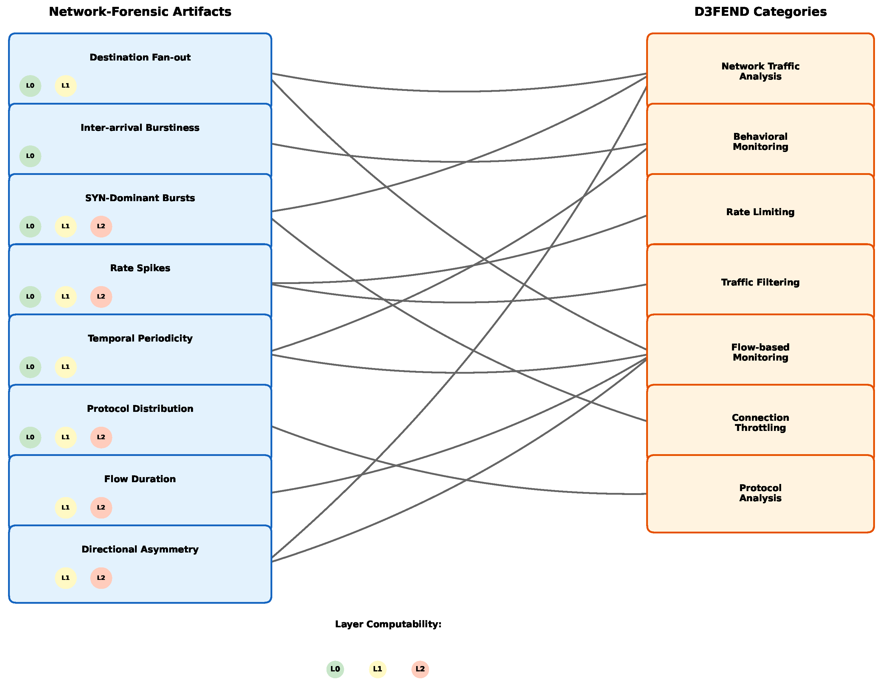 Why D3FEND Applicability Increases at L1: Flow-based monitoring techniques become enabled at L1 (requiring flow records), partially compensating for the loss of packet-level behavioral monitoring. For example, Flow-based Monitoring enables defensive techniques (e.g., flow-based rate limiting, connection throttling) that are not applicable at L0, where only packet-level behavioral monitoring is available.