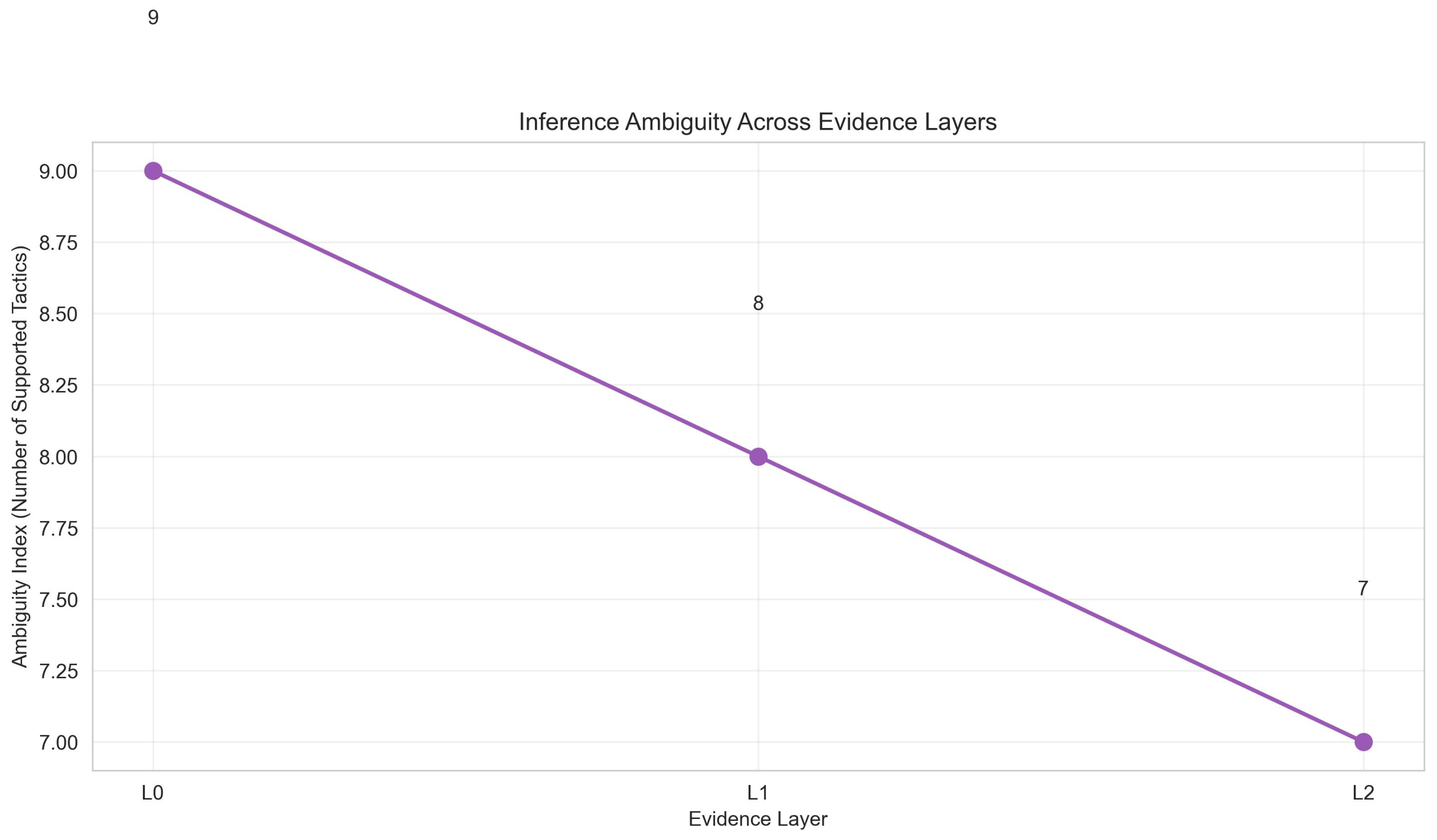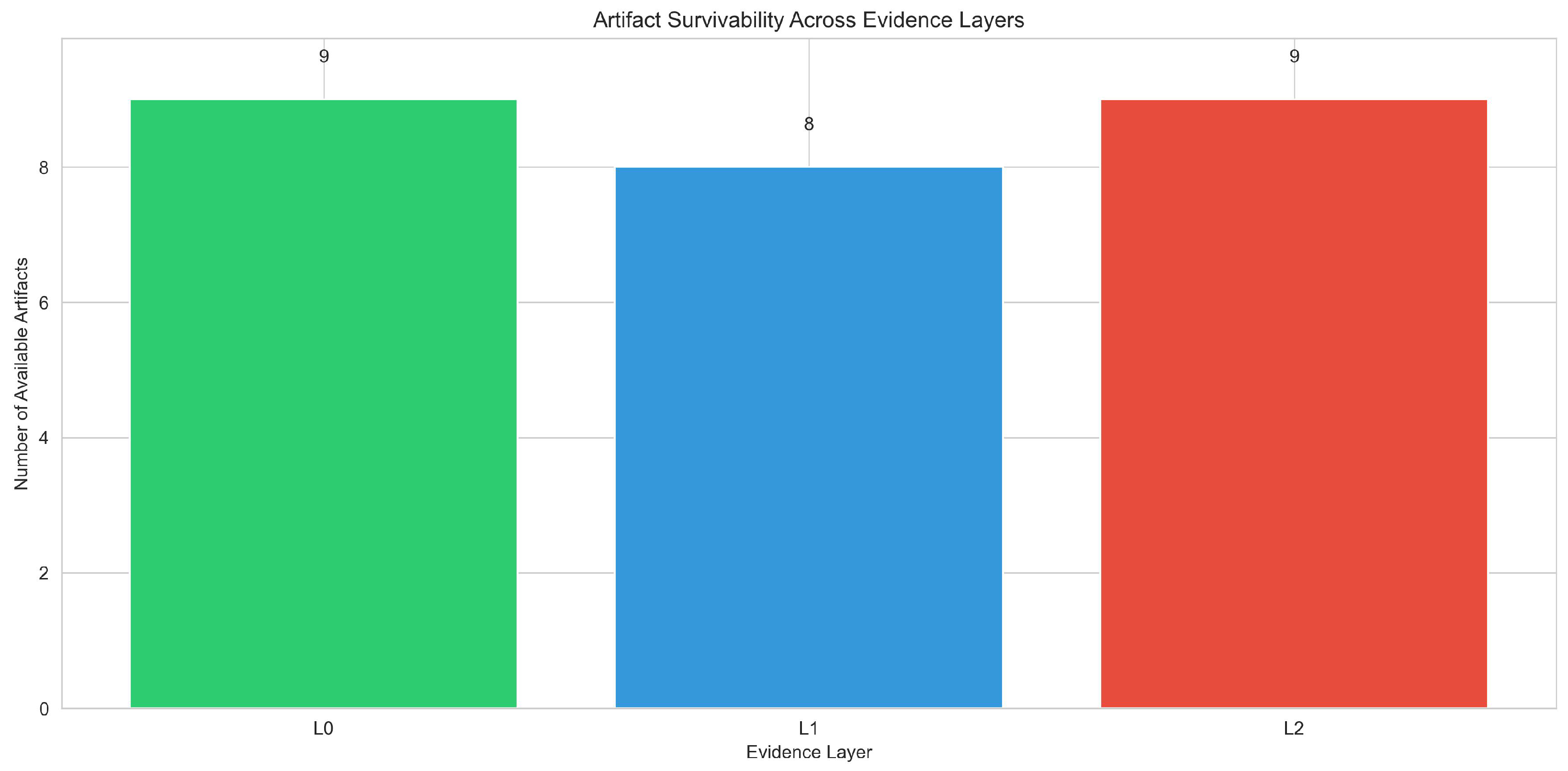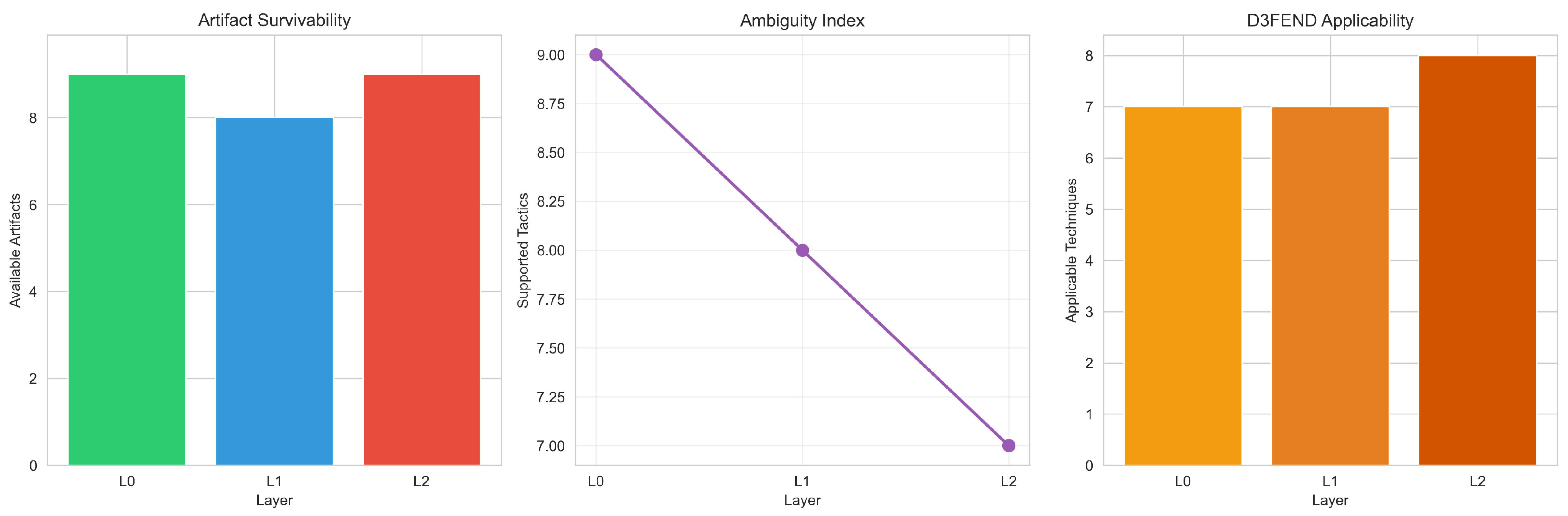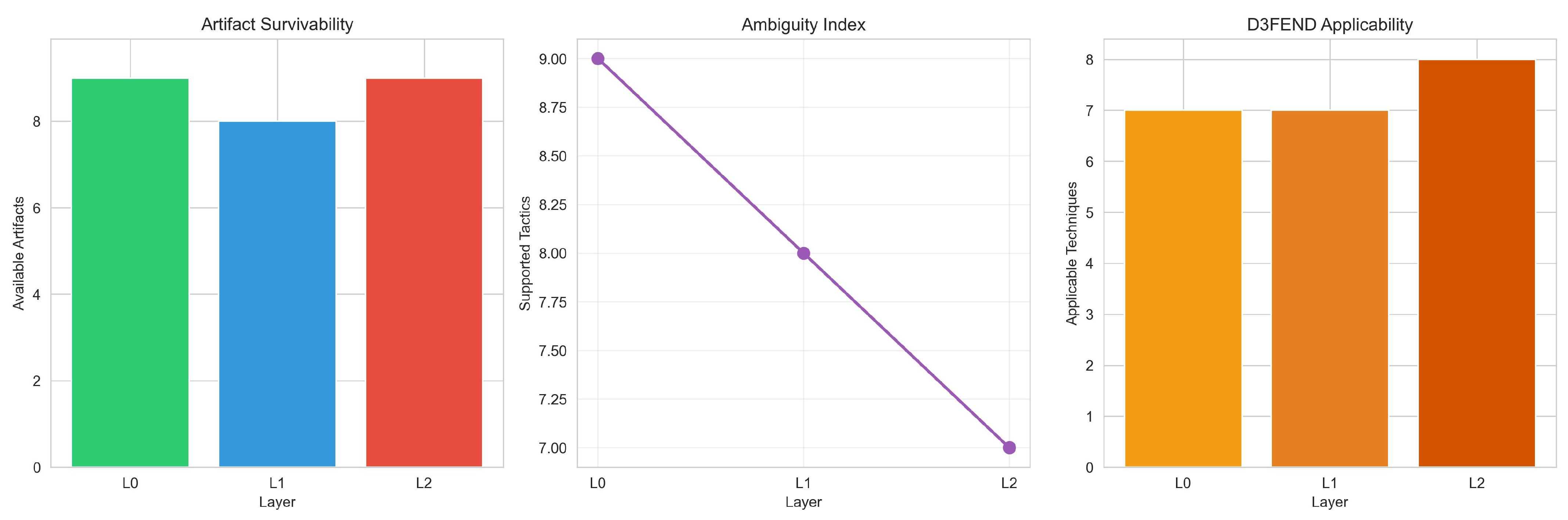 Forensic Coverage: Number of supportable ATT&CK tactics (L0: 9, L1: 8, L2: 7).