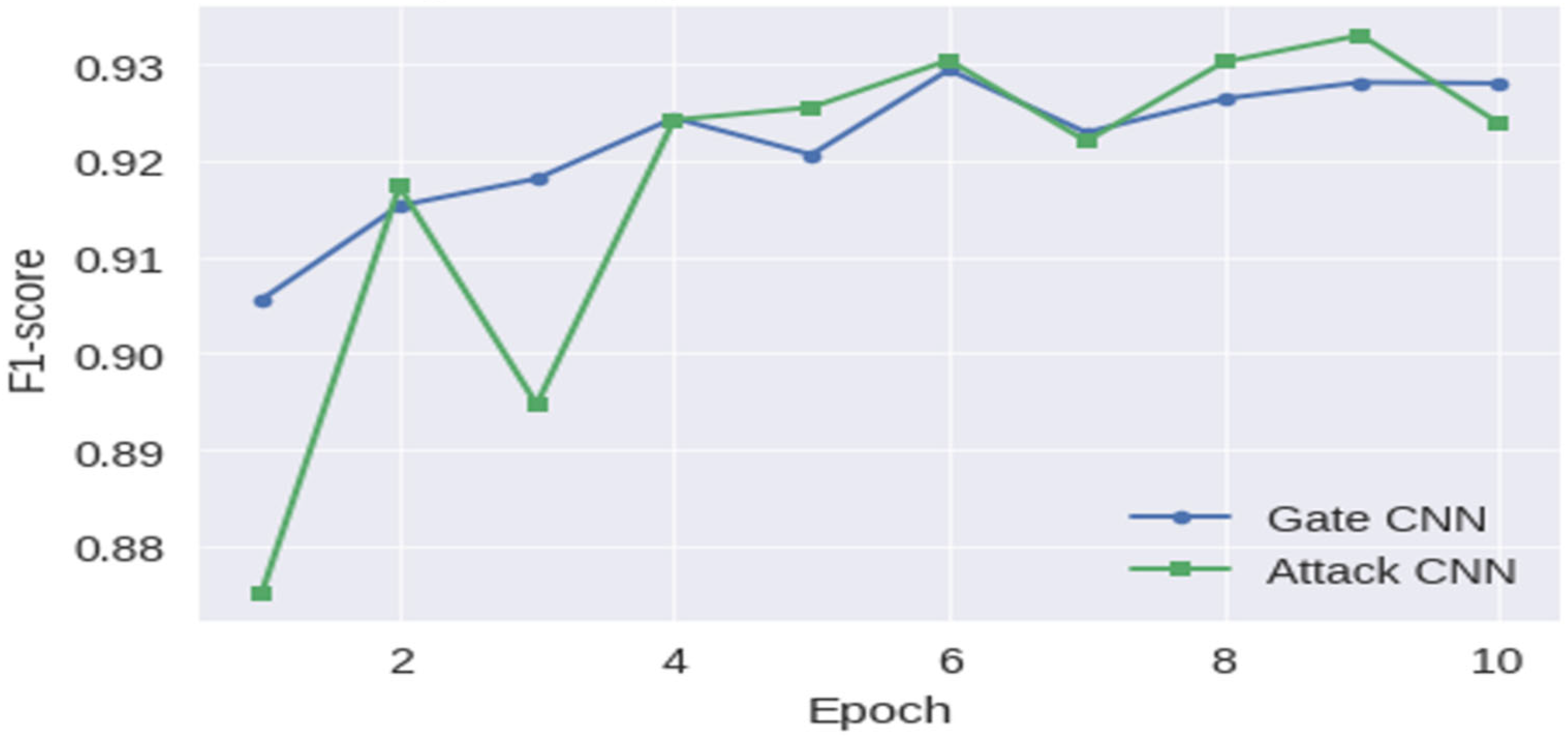 Figure 3 illustrates the validation F1-score progression of the Gate CNN and Attack CNN models across training epochs, providing additional insight into the closed-set training process.
