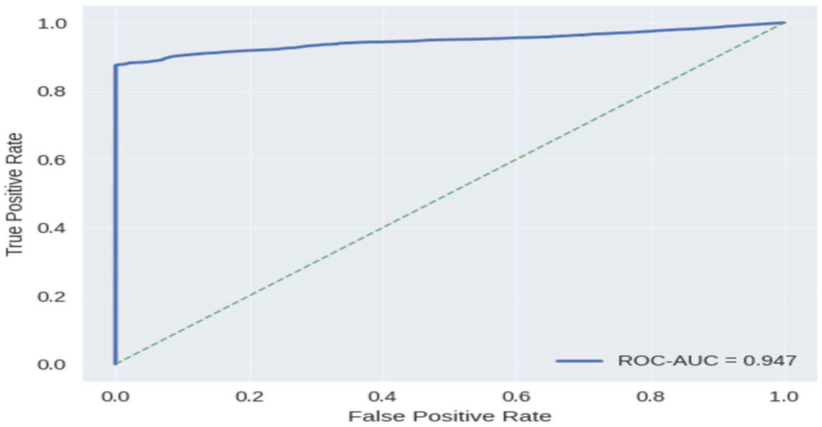 Figure 5 presents the receiver operating characteristic (ROC) curve for zero-day detection, with an area under the curve (AUC) of 0.9480, indicating strong separability between Normal and zero-day traffic across a wide range of decision thresholds. To assess sensitivity to the target recall parameter, Tc, the zero-day evaluation was repeated with Tc = 0.80, 0.90, and 0.95. At Tc = 0.80: Detection Rate 0.8895, FPR 0.0024, F1 0.9308. At Tc = 0.90 (our setting): Detection Rate 0.8747, FPR 0.0019, F1 0.9319. At Tc = 0.95: Detection Rate 0.8982, FPR 0.0029, F1 0.9296. The F1-score varies only between 0.9296 and 0.9319, confirming robustness to Tc variations while allowing operators to adjust the operating point without retraining. To assess the generalizability of the zero-day detection component across diverse attack categories, two additional exclusion protocols were evaluated on CSE-CIC-IDS2018. Under the second protocol, excluding Web_Attacks and BruteForce, the system achieves a detection rate of 0.9058, FPR of 0.0025, F1 of 0.8979, and AUC of 0.9519. Under the third protocol, excluding Botnet and DDoS, the system achieves a detection rate of 0.9701, FPR of 0.0019, F1 of 0.9807, and AUC of 0.9893. Across all three protocols, F1-scores range from 0.8979 to 0.9807 and AUC values remain above 0.9480, demonstrating consistent zero-day detection performance across diverse attack categories.