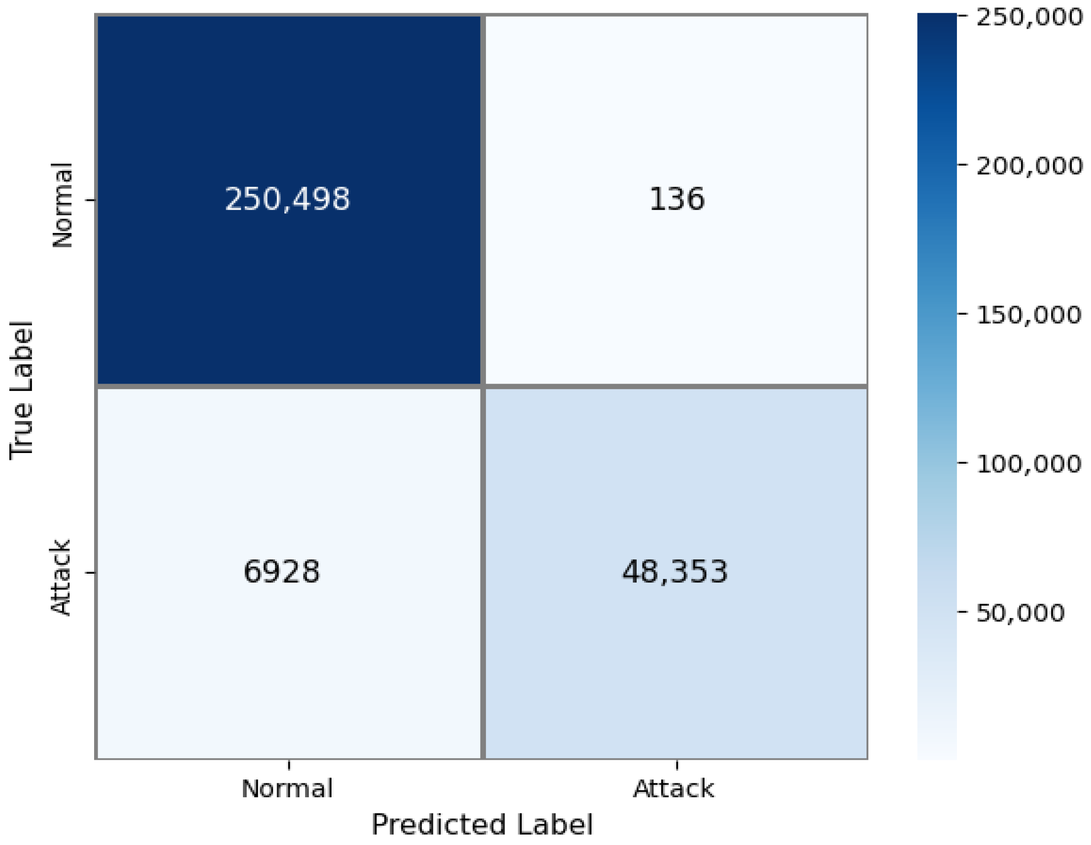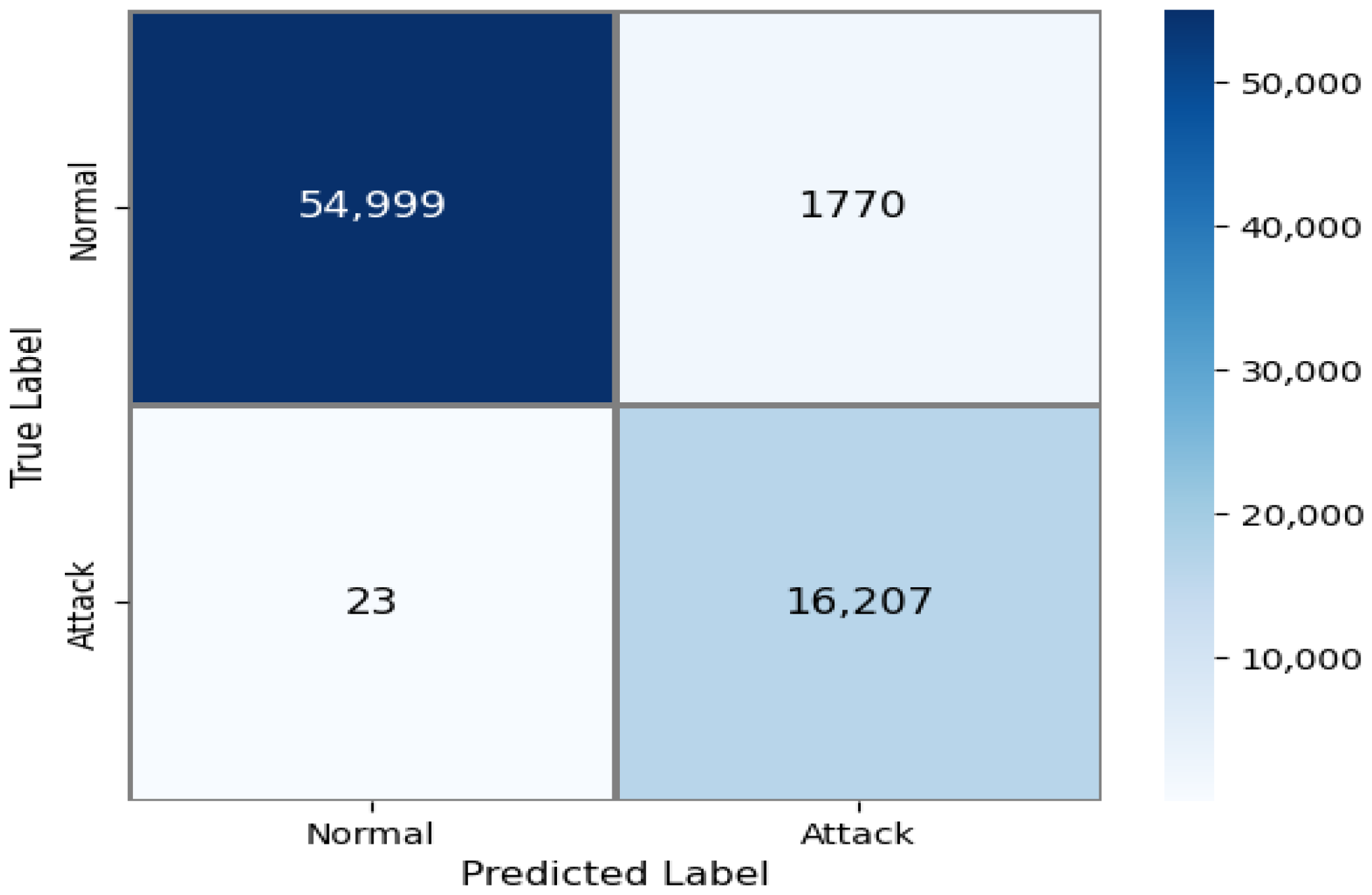 This subsection reports the performance of the proposed system in its integrated cascade configuration, which represents deployment-oriented behavior where closed-set classification and zero-day detection operate jointly, and traffic is classified as either Normal or Attack. Under this configuration, the integrated IDS achieves an overall accuracy of 0.9837, with a precision of 0.9177, a recall of 0.9996, and an F1-score of 0.9569. The false positive rate is 0.0198. The near-perfect recall reflects the cascade’s prioritization of comprehensive attack detection under operational conditions, where minimizing missed intrusions takes precedence over strict false-alarm suppression.