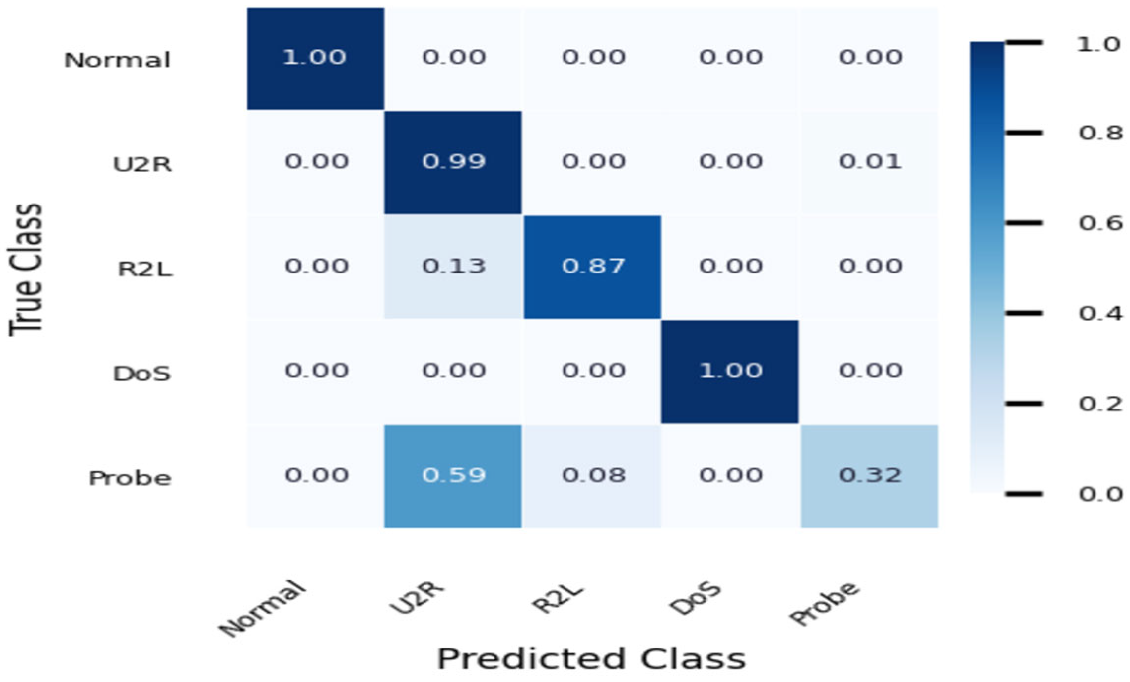 This subsection evaluates the performance of the proposed intrusion detection system under a closed-set multi-class classification. In this configuration, all traffic categories present during testing are known during training, and the model assigns each network flow to one of the predefined classes: Normal, U2R, R2L, DoS, or Probe. The model achieves an overall classification accuracy of 0.9618. The macro-F1-score is 0.8270, while the weighted F1-score is 0.9572, indicating strong overall classification performance under SUNE traffic conditions. Detection performance is highest for the Normal and DoS classes, both of which are classified with perfect precision and recall. The U2R class shows a very high recall of 0.9902 but a comparatively lower precision of 0.6209. The R2L class is detected with a balanced precision of 0.9035 and a recall of 0.8695. In contrast, the Probe class exhibits a lower recall of 0.3246, indicating that a substantial portion of Probe traffic is assigned to other attack categories. The distribution of classification outcomes across all classes is summarized in the normalized confusion matrix shown in