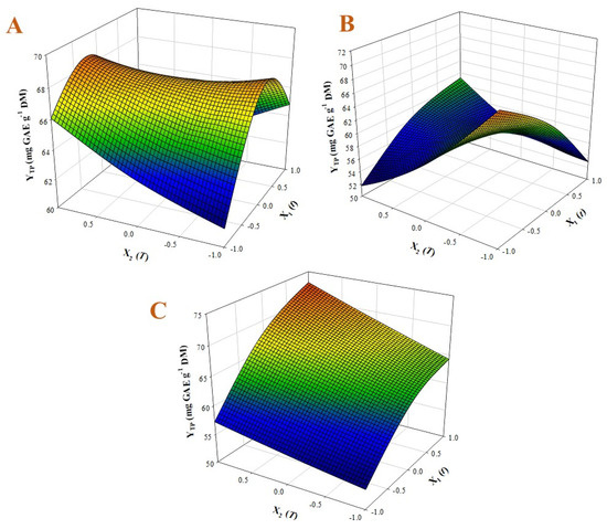 3D-plots illustrating the effect of the simultaneous variation of process variables (t, T) on the response (YTP). (A), extraction with GL; (B), extraction with GL-CA; (C), extraction with GL-SC.