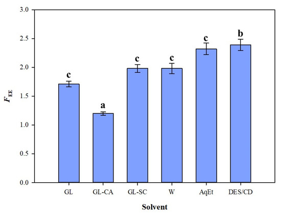 Extraction efficiency factor (FEE) determined for polyphenol extraction from OLL, by deploying various extraction processes. Assignment: GL, extraction with glycerol; GL-CA, extraction with the DES composed of glycerol/citric acid; GL-SC, extraction with the DES composed of glycerol/sodium citrate tribasic; W, water extraction; AqEt, extraction with 60% (v/v) ethanol/water; DES/CD, extraction performed with a DES comprised of lactic acid/ammonium acetate, containing 0.7% (w/v) β-cyclodextrin. Columns assigned with different letters (a, b, c) represent statistically different values (p < 0.05).