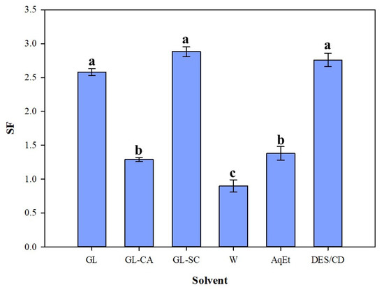Severity factor (SF) determined for polyphenol extraction from OLL, by deploying various extraction processes. Assignment: GL, extraction with glycerol; GL-CA, extraction with the DES composed of glycerol/citric acid; GL-SC, extraction with the DES composed of glycerol/sodium citrate tribasic; W, water extraction; AqEt, extraction with 60% (v/v) ethanol/water; DES/CD, extraction performed with a DES comprised of lactic acid/ammonium acetate, containing 0.7% (w/v) β-cyclodextrin. Columns assigned with different letters (a, b, c) represent statistically different values (p < 0.05).