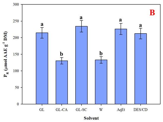 Antiradical activity (AAR) (plot (A)) and ferric-reducing power (PR) (plot (B)) determined for polyphenol extraction from OLL, by deploying various extraction processes. Assignment: GL, extraction with glycerol; GL-CA, extraction with the DES composed of glycerol/citric acid; GL-SC, extraction with the DES composed of glycerol/sodium citrate tribasic; W, water extraction; AqEt, extraction with 60% (v/v) ethanol/water; DES/CD, extraction performed with a DES comprised of lactic acid/ammonium acetate, containing 0.7% (w/v) β-cyclodextrin. Columns assigned with different letters (a, b) represent statistically different values (p < 0.05).