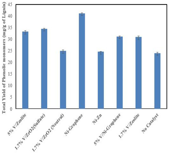 The phenolic monomers collected from the depolymerization process of the alkali lignin in subcritical water with catalysts are identified by GC-MS. Figures S2–S4 show the resulting chromatograms. The cleavage of the C-O bond in the alkali lignin took place in the presence of subcritical water and catalysts. The main products were found to be monoaromatic oxygenates or phenolics. Twelve different phenolic monomers were identified from the alkali lignin, shown in Table S2. The heterogeneous catalysts studied enhanced the lignin depolymerization, reducing the reaction time and the formation of char, as shown in Table 2. The standard calibration curves of guaiacol, vanillin, isoeugenol, acetovanilone, guaiacylacetone, and homovanillic acid, provided in the supporting information catalysts, are linear over the calibration range (R2 > 0.9998). Figure 3 shows the yield of total, combined phenolic monomers from the alkali lignin in the presence of subcritical water and the different heterogeneous catalysts at 240 °C for 10 min. The total yield of phenolic monomers is shown in Table 2. The table shows that the catalyzed reactions produce 25–70% more total monophenols than the reaction with no catalyst. The lowest results were obtained with the Ni-Zn and 1.7% V/ZrO2 (Neutral) catalysts, which were identical to reactions performed under similar conditions without catalyst. The Ni-graphene catalyst produced the highest yield of phenolic compounds, 41.16 ± 0.27 mg/g, of the catalysts evaluated, perhaps due to the high surface area of the Ni-graphene. In terms of weight percent, 62% conversion to phenolic monomers is obtained in the presence of Ni-graphene catalyst and 38% of residue is left over from the reaction. No char formation is observed in the residue from the reaction because of the lower temperature used for the reaction [34]. The 5% V/Zeolite (33.28 ± 0.44 mg/g) and 1.7% V/ZrO2 (sulfate) (34.46 ± 0.22 mg/g) catalysts showed similar conversions.
