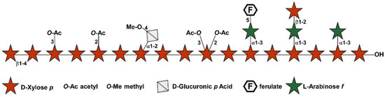 Figure 1 demonstrates the xylan structures that can be found on xylan in monocots and dicots. In xylan, approximately 100–200 xylose monosaccharides are linked to each other by β-(1,4) bonds, forming the structure of the xylan backbone. Monosaccharides such as glucuronic acid (α-1,2), 4-O-methylglucuronic acid (α-1,2), or arabinose (α-1,2 and or α-1,3) can be attached to the backbone by the sidechains (Figure 1) [7]. Xylan could be acetylated at the O-2 and/or O-3 positions. Some arabinosyl sidechains can be decorated with ferulic acid esters in monocots. According to the nature of the sidechains, xylans can have names such as glucuronoxylan, methylglucuronoxylan, and arabinoxylan. Glucuronoxylan is the dominant xylan in the secondary walls of dicotyledonous plants [6].