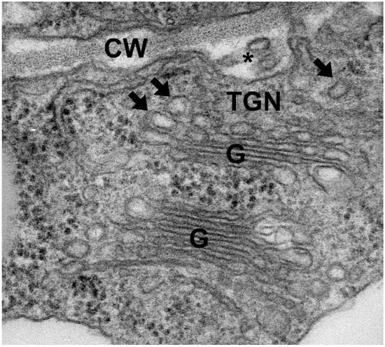 The Trans Golgi Network (TGN) (Figure 2) is responsible for directing the molecules exiting the Golgi to the vacuoles or plasma membrane with the necessary vesicles or endomembrane transport structures in the system [30]. Compared to other eukaryotes, the Golgi apparatus and the Trans-Golgi Network have a specialized function in plants. This task is the biosynthesis of biosynthetic enzymes, structural proteins, and various matrix polysaccharides (such as hemicellulose and pectin) required for the cell wall, and their cargo and delivery to the cell wall [31,32]. The transport of polysaccharides by the Golgi apparatus to the cell wall happens via vesicles. The electron microscopy image in Figure 2 shows vesicles leaving Golgi (arrows) and vesicles (asterisk) being transported to the cell wall through TGN. In this process, vesicles fuse with the plasma membrane and release their content into extracellular space. However, information on the types of vesicles and which cargo polysaccharides they carry is very limited.